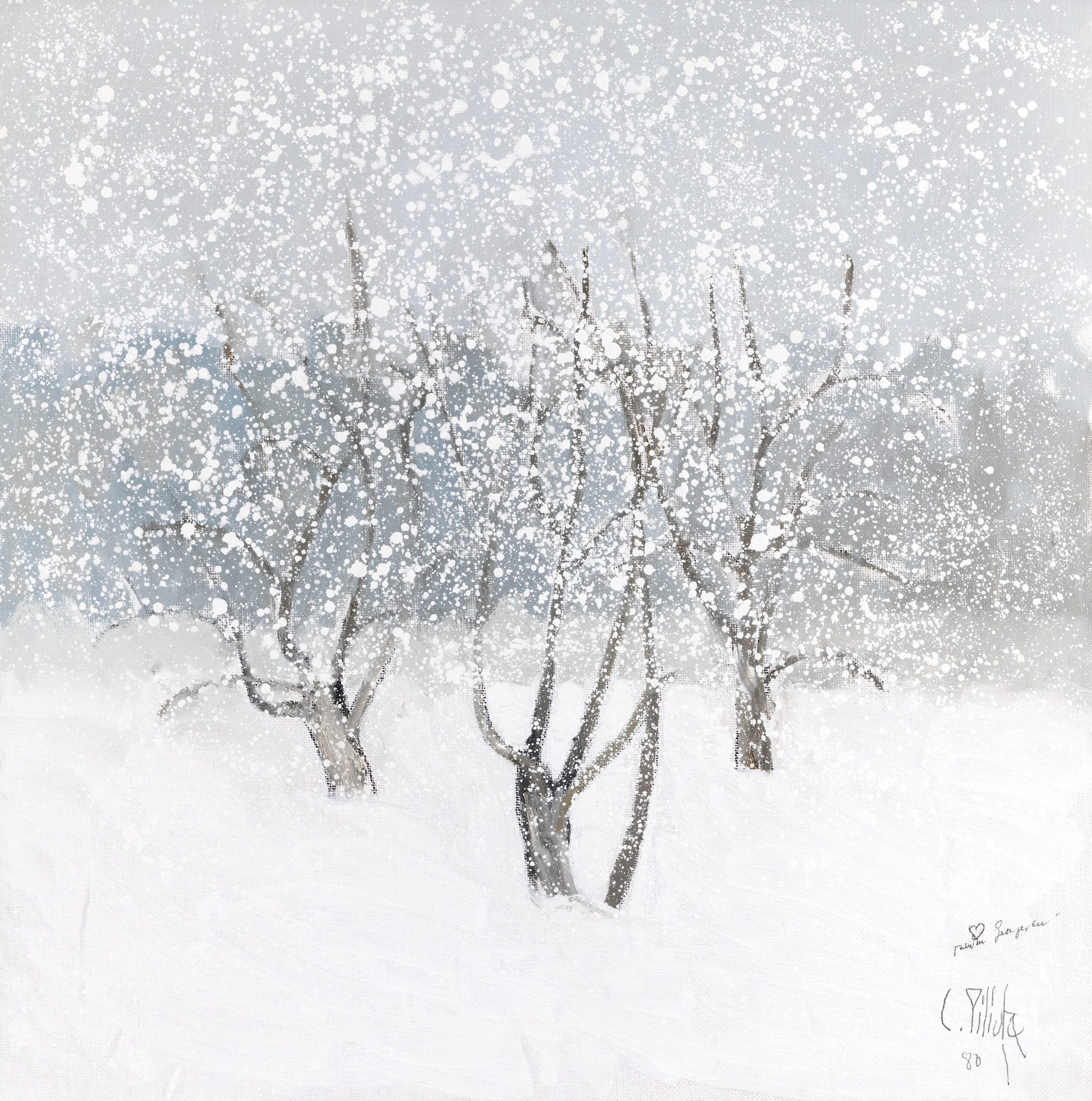 Constantin Piliuță undertakes a laborious process through which he continues the tradition of national lyricism. In his creation, we often encounter landscapes of memory, already lived landscapes, transposed from memory. Piliuță reveals his lyrical-reflective character by creating an imagistic repertoire that takes the form of profound meditative paintings. His painting is discreet and elevated, and his drawing presents itself as simple and well balanced. The artist develops a luminous crescendo through the careful reporting of touches in dark shades to the evocative white that articulates the work. He pays special attention to the dimension of white, which he successfully translates into plastic matter. Evocative and meditative, he remembers and embeds the image of his birthplaces over time. He draws from the characteristics of French expressionists, focusing more on a unitary ensemble and less on stylistic details. The artist focuses on outlining a fast universe, dedicated to the love of people and nature, in which he includes, through repetitions, winter landscapes, horses, musicians or ballerinas, to which he gives new valences.