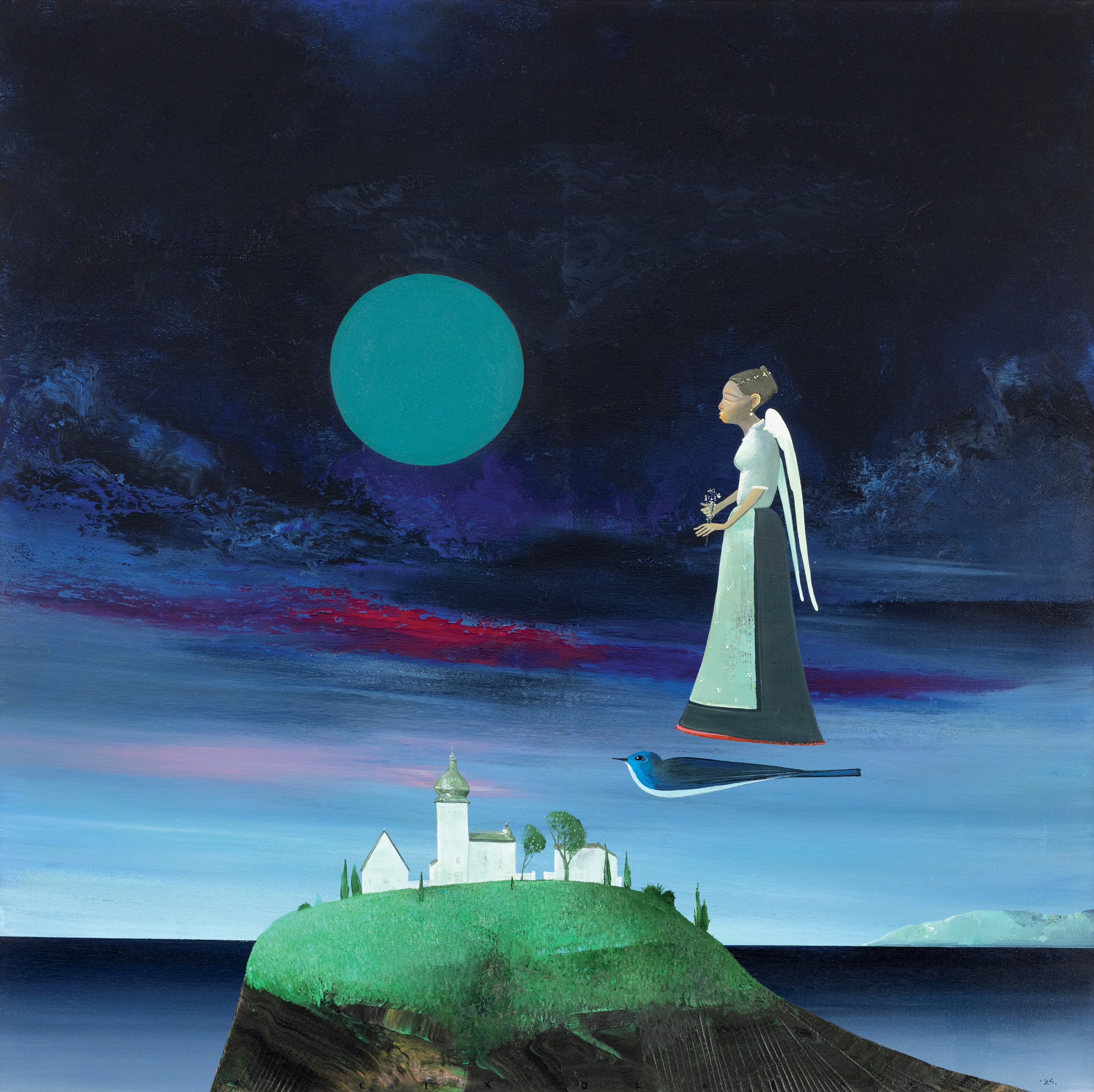 Signed and dated at the bottom center, with black, "Felix Aftene (20)24"; signed, dated and titled on the verso "Felix Aftene, 2024, 'Blue Moon', 'Earthly Paradise' cycle"
