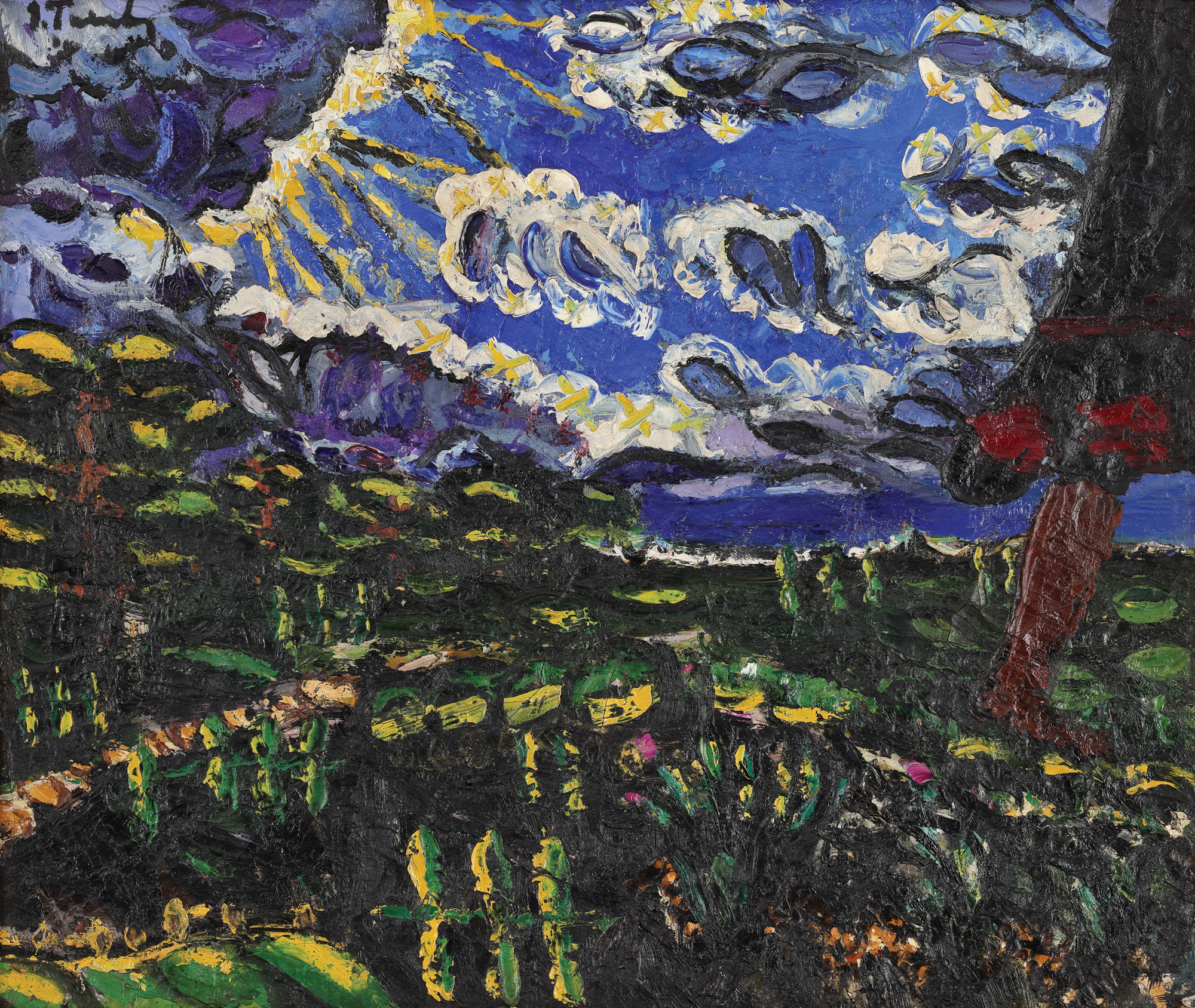 The folkloric period in Ion Țuculescu's creation has its genesis in the middle of the last century, but in the absence of clear dates, this period can only be roughly framed between 1947-1956. It is a stage reserved for complex processes that encompass the artist's passions and his predilection for folk motifs. The folkloric period divides into three stages, as observed by Magda Cârneci, with the present work being included in the first. This is a stage where decorative elements suddenly appear in works, so we will encounter, seemingly out of context, plant elements stylized according to traditional decorative objects. The series of works now reveals oscillations, evolution, or returns to elements of interest to the artist. Ion Țuculescu will use his aesthetic and spiritual revelations to bring his works out of anonymity. Țuculescu asserts himself as an authentic interpreter of nature and particularly excels in creating landscapes. If the decorative elements are rather flattened, the landscape keeps its three-dimensionality to some extent. However, the decorative function is blurred, and the distinction between the figurative decorative system and the popular one is emphasized. The exceptional vocation of the colorist is accentuated by harmonious alternations of strong tones and the intentionally exaggerated use of paste. The artist borrows from the pictorial manner of the expressionists and excels in illustrating rhythms and in painting brushstrokes. His plastic space, infinite and with unusual materializations, is crossed by artificial brightness and a brutal chromaticism which has become a leitmotif. It goes beyond the decorative, purely imitative framework and tends toward the emotional charging of the canvas by using an exacerbated palette. His ornamental chords are set in black accents, a shade he assimilates from Petrașcu's works. He reinterprets the folkloric elements in a deeply modernized manner and transfers the analytical vision of the biologist into feverish attempts to exhaustively render frescoes dedicated to nature. Țuculescu is interested in highlighting the figurative-decorative dichotomy, while also emphasizing spatial principles. The feverishly imparted brushstrokes and electric blue hues confirm the similarities intuitively noted by critics from his first exhibitions with world-renowned artists like Van Gogh.
