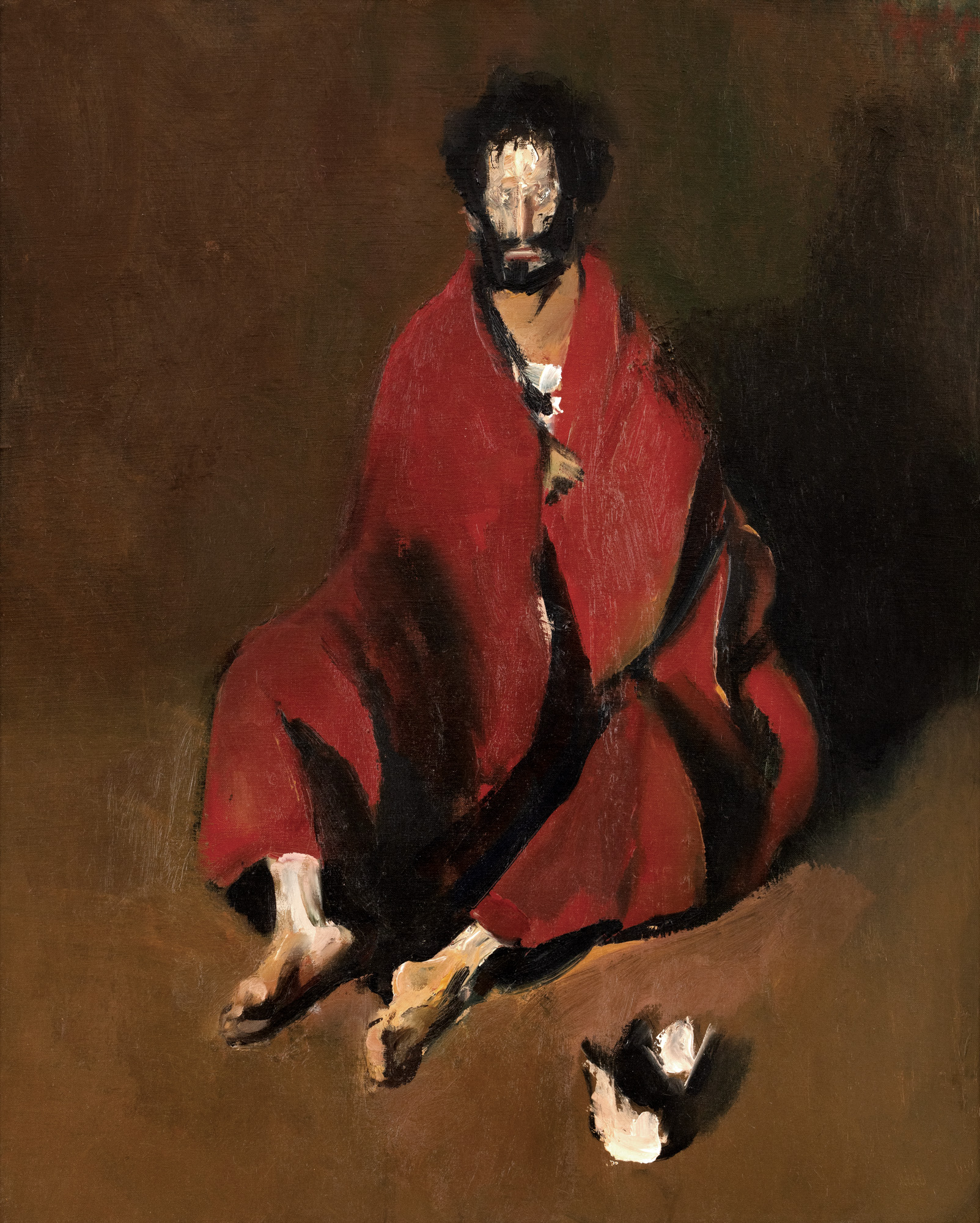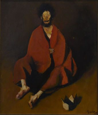 The roots of manifestations in the genre of portraiture reveal themselves from an early age: in high school, Corneliu Baba was known as the "portraitist of the city." Most of the notable personalities of Caransebeș posed for him. Gradually, he makes self-portraits, portraits of loved ones or of reputable names such as: Tonitza, Enescu, Sadoveanu and Arghezi, or he stops on particular subjects: the mad king, peasants or the harlequin. The physiognomy, face and inner features of the characters stand out, at Baba, as a vehicle of human psychologies. The artist consecrates, symbolically, archetypes such as the harlequin or the mad king. For Corneliu Baba, the notion of realism takes on a much wider meaning and enjoys the artist's ability to use his imagination and the reserves of the psychic fund. The journals kept by the artist throughout his life represent a valuable treasure in which details regarding his life and work are carefully noted. Taciturn and solitary in the decades marked by cold and darkness, the master will concentrate his pen and brush on his artistic perfection. Named by Corneliu Baba as the "portrait without a biography", the mad king transcends beyond this title and develops throughout an entire cycle of dedicated works. The artist noted about the subject: "my mad king, in all the paintings, is nothing but the "poor man" sick, tortured by phantoms and the echo of the curses of those who had the chance to survive his acts of violence and sadism, from the pathetic hour of his horrible glory." The dramatic tension of the subject is therefore constituted from quasi-demonic impersonations and unspoken interior apologies. The crownless king becomes an allusion to all the horrors and atrocities that the artist, like so many millions of his contemporaries, had to passively witness. Corneliu Baba works consistently, adding reds and grays where he feels necessary. Visually, he starts from Goya's work, and auditory, on the background of his workshop and of the opera lies the music of Grieg - Peer Gynt. Scared, tortured, in monumental poses or illustrated drawn out, to the ground, with a gaze deprived of pupils, but with expressive grimaces; with hands extended towards an uncertain direction or propped in the ground; sitting directly on the floor, the king confined in the grip of his own prison appears obsessively in Corneliu Baba's work starting with the ‘70s. The improvised robe that covers his whole body, depicted either in low tones or in strong shades of bright red, the lost gaze and the bare soles; the paper crown or the lack of it (placement, in this case, near it) or the vagabond dog that accompanies him throughout several works reveal a dynamic composition, charged with interior tumult.