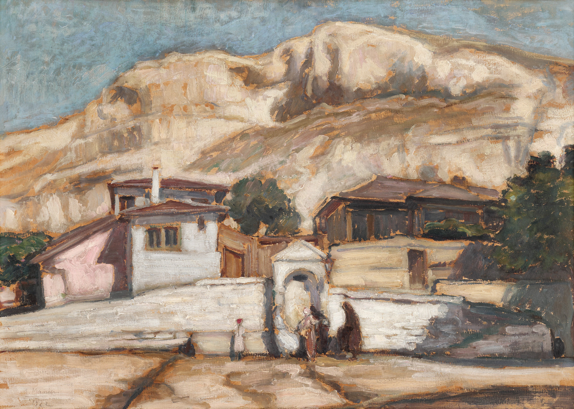 Whether she's painting boats moored in ports, or focusing on canvases through which gusts of wind break; whether she's painting Douarnenez, the Danube Delta, Șopârlița, Balchik or Agapia, Rodica Maniu creates true compositions, carefully studied, for which she will be rewarded with prizes in Paris or Barcelona. The encounter with Balchik will take place against the backdrop of the trips made alongside her partner, the painter Samuel Mützner, along the Black Sea. The house with a terrace built right above the gulf will be the home-studio during the warm season and will serve as an endless source of inspiration for the artists. The couple will undoubtedly become an important presence within the group of artists who gathered in the summer at Balchik. The Black Sea settlement will be perceived as a space of imagination, rich in pictorial motifs, so we will often find the blue of the sky and the sea, the white of the rocks and houses, or the brown inserts from fences and roofs. The human silhouettes will also be omnipresent, the tatar women covered with veils will often be arranged in the landscape, merging and embracing its color.