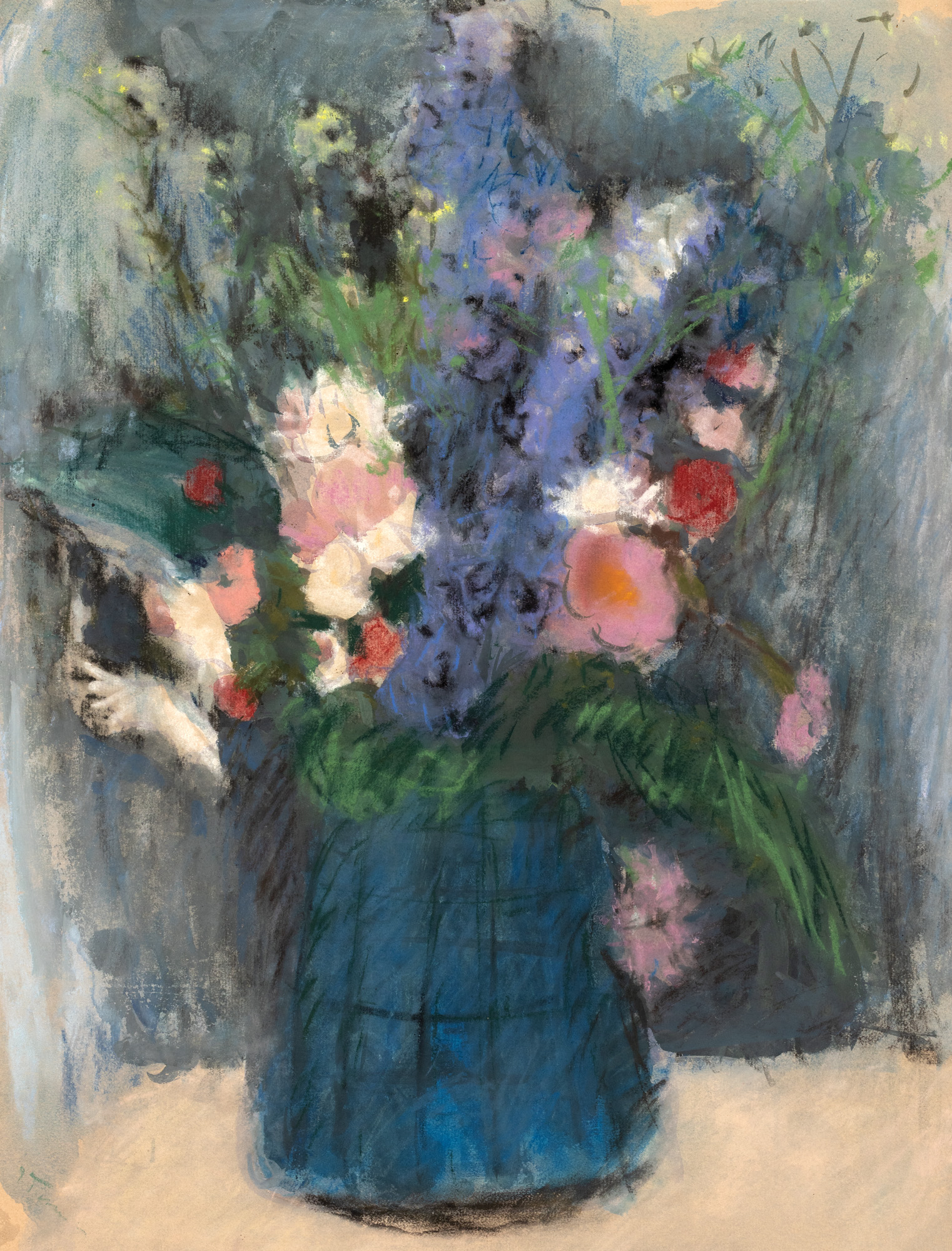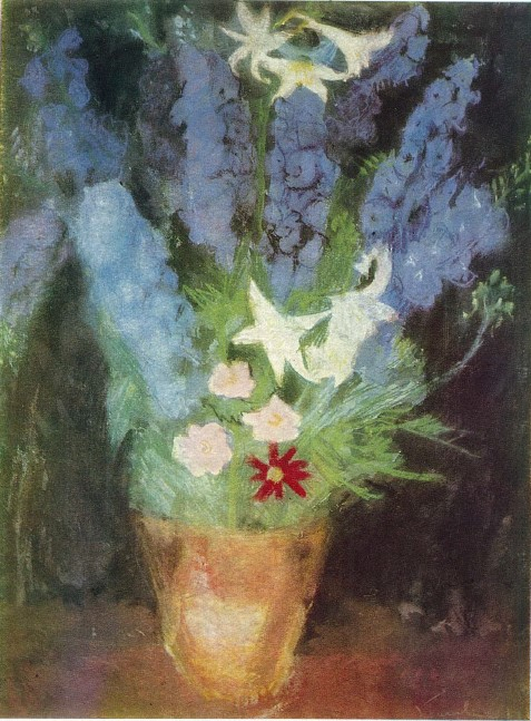 The present artwork dates from the artist's reencounter with painting, a period profoundly marked by the intensity of color. Țuculescu graduated from medical school "magna cum laude" and began his career as a natural science teacher. However, his chosen career path would still allow him to continue dabbling in painting. He made his debut as a painter in 1938, during a solo exhibition held at the Romanian Athenaeum. The exhibition aroused the curiosity, interest, and admiration of critic George Oprescu, as well as the appreciations of Gheorghe Petrașcu. Gifted as an autodidact, he conducted free studies, "from nature and masters", as he himself says. He would use his dual vocation, as a biologist and creator, to transcribe true pages of nature onto the canvas with the ingenuity of a scholar. He retraced the travels of his predecessors in the Mediterranean East and the significant western capitals, thus regaining the visual material necessary for future plastic experiments. He drew inspiration from Petrașcu, Andreescu or Luchian, but also focused on a Van Gogh or a Gauguin. His plastic space, infinite and with unusual materializations, is crossed by an artificial brightness and a brutal chromatic intensity that became a leitmotif. His ornamental harmonies are inlaid with accents of black, a shade assimilated from Petrașcu's works. He keeps recognizable fragments of the real space he draws inspiration from, but modifies them according to his own stimuli. From rapeseed fields and views of Romanian villages to Venetian canals, stone bridges, and coloured buildings of Italy, Ion Țuculescu takes us on a welcome journey around the world with his works. Whether he is working in oil or transplanting the urban landscape into watercolour, the artist aims to transform the sheet into a visual diary of his own life. The series of vases with flowers, specific to his debut, stands out through a much duller chromatic range compared to the one adopted by the artist in his famous rapeseed fields. It is, therefore, a period of search and rediscovery, a period of establishing the artistic direction. The vase with flowers, predominantly composed of shades of blue, reveals the botanist passionate about science and fine details. In the history of Romanian art, Ion Țuculescu remains the amateur who became a professional, with an immeasurable power to revitalize the outdated stylistics of folk art.