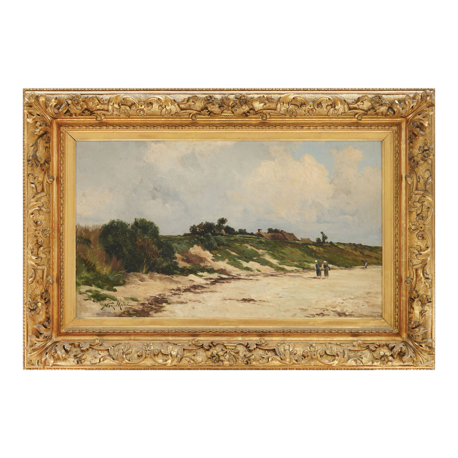 Nikola Mašić, a renowned painter of genre scenes in landscape, was highly esteemed and distinguished during his creative period at the cusp of 19th and 20th centuries but was almost forgotten in the ensuing decades, until recent times when two extensive, research-based exhibitions were organized in Zagreb with the aim of reassessing his oeuvre. These exhibitions were held at the Modern Gallery (today NMMU), which owns more than a hundred of Mašić's works. They were curated by museum advisor Dajana Vlaisavljević; the first in 2017 under the theme of Croatian modern animalistic painting titled "All Our Animals" to which she included twelve of Mašić's paintings; and the other in 2018 when she organized a critical retrospective of the painter's opus titled "Nikola Mašić – Noble Realist" exhibiting 125 of the painter's most selected works. Included (and reproduced) in this latter exhibition was the painting "Landscape with Farmers" that displays the painter's entirely modernistic conception of landscape painting. Mašić wrote in a review for a newspaper, "one should paint in full light and directly in nature", a sentiment that the curator of the above-mentioned exhibition quotes and then concludes: "The silent man Nikola Mašić painted the world around him as he saw it, building his paintings meticulously and responsibly according to the principles of his education and the spirit of the time." Nikola Mašić spent his childhood and youth with his twin brother Aleksandar, also a painter, in Trieste and Vienna. After completing high school, their life paths diverged. Nikola first attended the Vienna Art Academy, then in 1872 moved to the Munich Academy. Due to frequent illnesses caused by tuberculosis, he had to return to Otočac several times. A series of the painter's studies from Krajina have been preserved from one such break in 1875. He graduated in 1879 and immediately thereafter, the Munich Academy offered him a studio where he produced a significant part of his body of work. From 1878 to 1881, Mašić frequently visited Posavina, where he painted intense water scenes and rural courtyards in the manner of "pure painting", prompted by his study visits to Paris in 1887 and Italian Campagna in 1880, where his first-rate marines and views of Vesuvius were also created. The same year, in a Sava backwater, he painted an outstanding oil painting "Painter in the Marsh". After finally returning to his homeland in 1884, he was appointed professor at the Craft School in Zagreb, and in 1894, director of the Strossmayer Gallery of JAZU. Simultaneously, he was very active in the exhibition scene. BRP