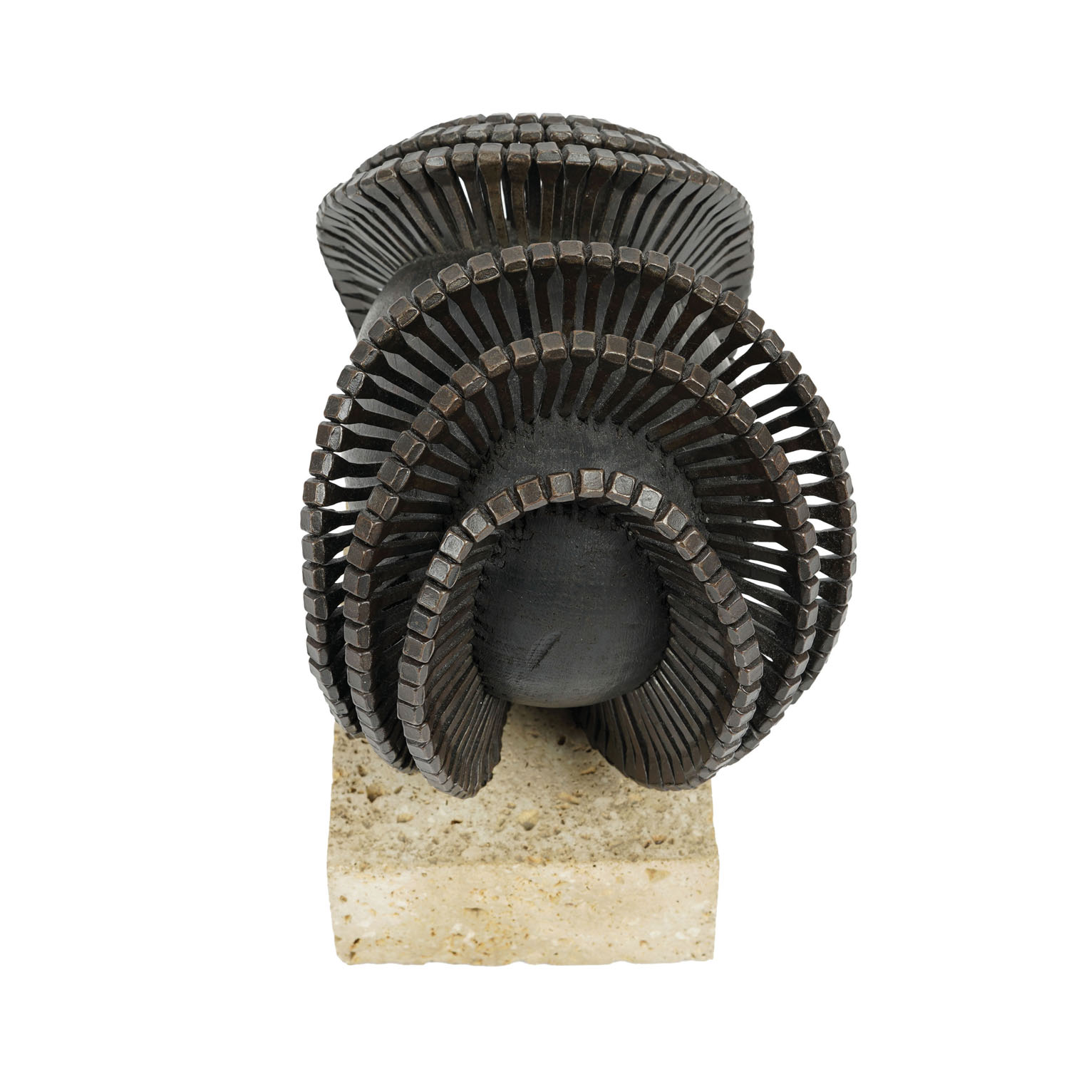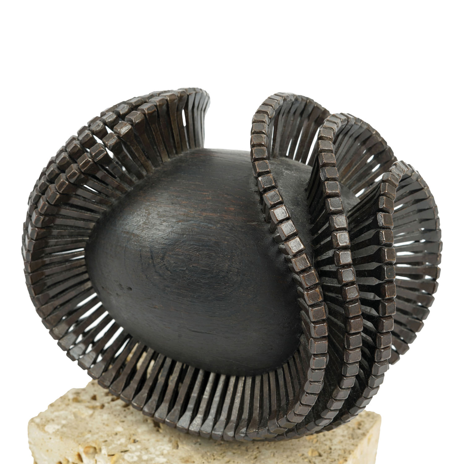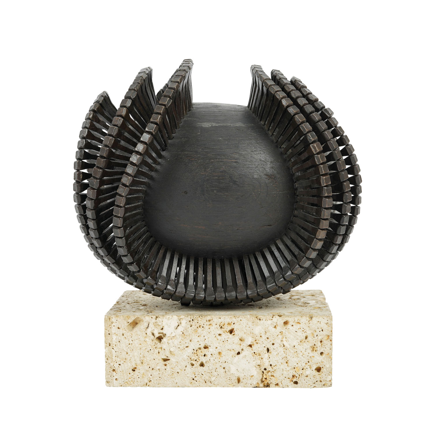 The sculpture S I - 84 by Dušan Džamonja is characteristic of his mature oeuvre. All his knowledge of sculpture, his sense for form, as well as his specific poetics built during his entire life of studying elements of sculptural language and experimenting with it, are visible in this smaller dimension sculpture, yet with a strong expressive charge. Dušan Džamonja was born in Strumica, Macedonia in 1928 and died in Zagreb in 2009. His work is highly esteemed in the domestic art history and can be found in some significant world museums (for instance, MOMA in New York or Tate in London). Džamonja's modernist (or late-modernist) poetics are evident here in the dynamic and contrasting relationship between materials, textures and shapes, in insisting on expression in pure form and achieving a rhythmic and balanced composition with an abstract form, non-narrative and non-descriptive. The very name of the sculpture, which is actually its label, testifies to its independence from any concepts from reality. The contrasts of rough surfaces and geometric compositions are characteristics for which Džamonja's sculptures are known. This sculpture also finds its basic idea in the dynamics of contrast. The basic contrast here is achieved between the central, egg-like part made of wood, which with its shape and material, suggests softness, and the iron nails driven into it in regular curves, which signify a ruthless communication of this shape with space. This skillfully performed incursion into space from a closed center shows the artist's knowledge of the laws of dynamic three-dimensional construction. In the 1980s, Džamonja was already an experienced sculptor, and his knowledge of the language of abstraction and all the effects that abstract sculpture can have can be seen in such smaller dimension achievements. FG