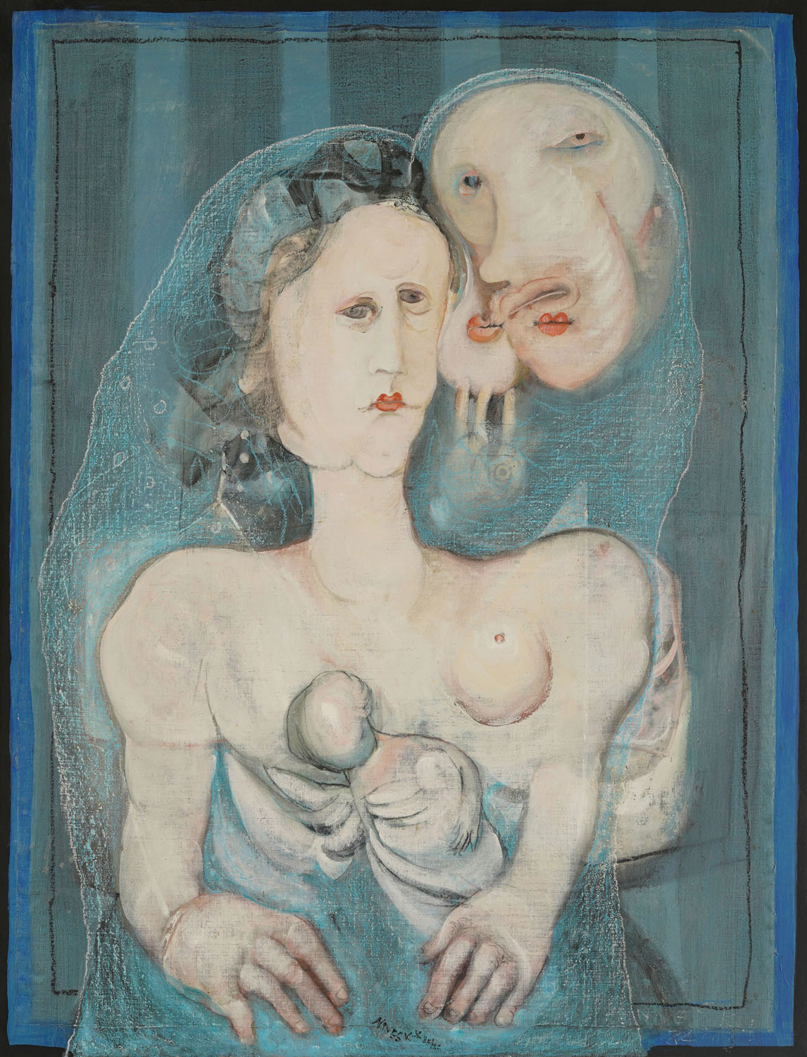 Nives Kavurić Kurtović represents a specific chapter of our art history that combines intimacy, surrealism, pop-art, and figuration into a unique, dark, and unusual expression. She was born in Zagreb in 1938, where she also died in 2016. She gained her expression by synthesizing different styles and personal experiences and inspirations in the Master Workshop of Krsto Hegedušić. The painting "United without Socializing" is characteristic of her oeuvre. Dissolved, grotesque figures, with deformed faces and painted in translucent applications of pale colors, they remind us of a wedding photo because of the veil on the head of the largest, female, figure. All the characters that gather around the female figure with a veil could represent the family that marriage presupposes. But this is not a picture of happiness and harmony, but even the character next to it and the creature (probably a child) on her breasts are like demons that haunt and mentally exhaust the bride. This painting reveals the other side of the family idyll imposed as a standard aspiration by our society. The dissolution of form here corresponds to the dissolution of the individual psyche within imposed frameworks. Consequently, the painting also reveals the rotten foundations of society, points to the hell that family life often represents (most often to women), and thus, through the prism of personal psyche, acts as a scream of protest. Characteristic of this author, the dark picture of life is titled with a black-humored play on words in which the institution of the family negates and annuls the very root of the word "united", which suggests unity, collaboration, or a shared vision. With this painting, the artist seems to say that everyone is alone in their mental dungeon. FG