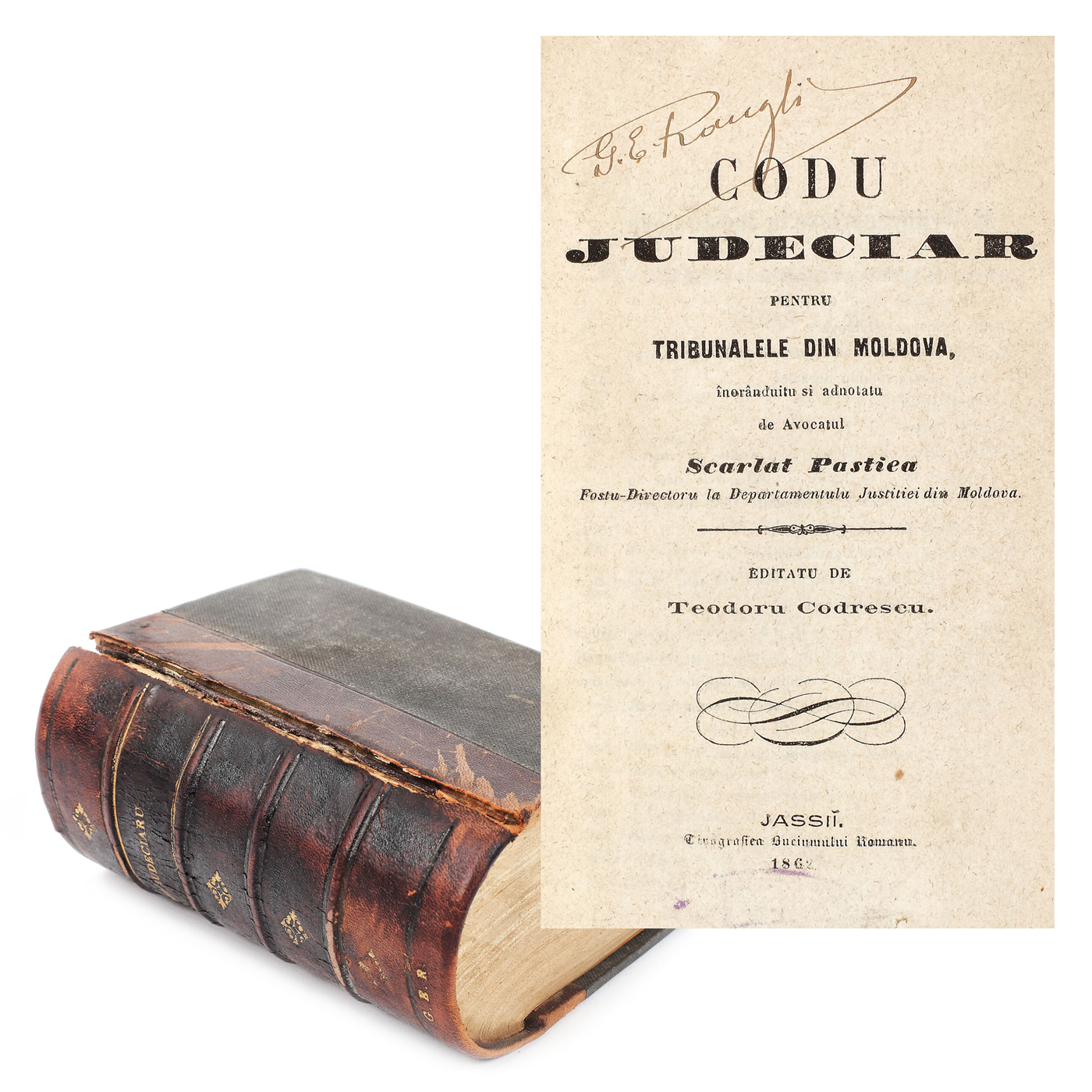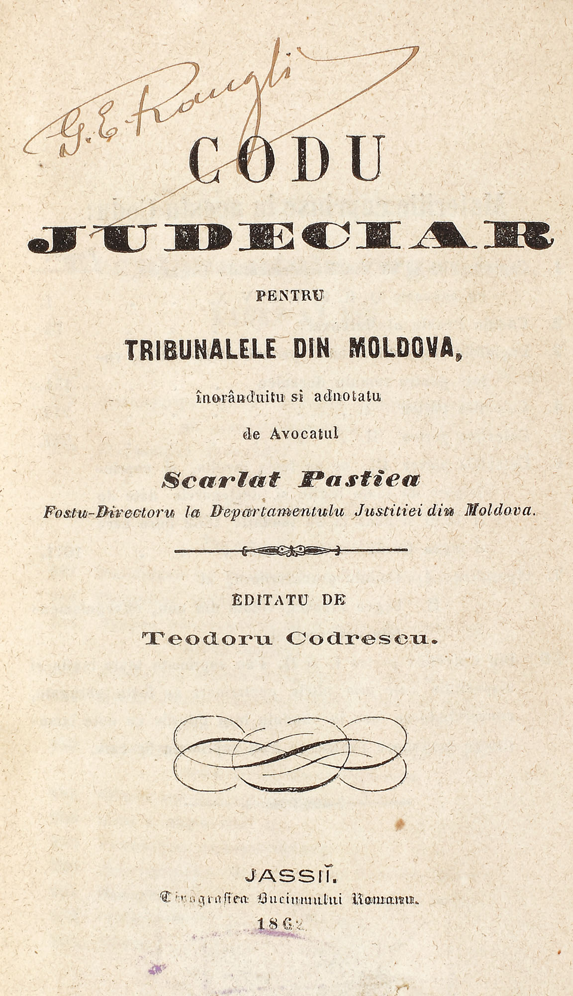 53. "Codul judiciar pentru tribunalele din Moldova", de Scarlat Pastiea, Iaşi, 1862