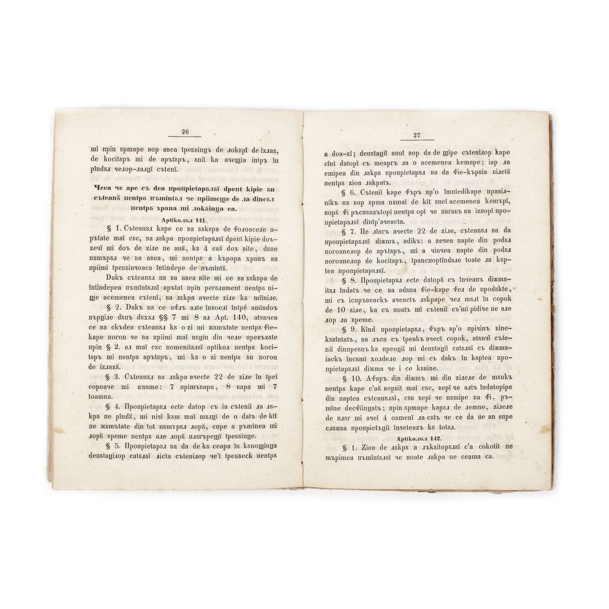 Volumul cuprinde o litografie reprezentând "Dorobanţii de judeţe", semnată K. D. Dintre actele cuprinse menţionăm; Legiuire pentru reorganizarea dorobanţilor judeţelor, legi pentru modificarea sfaturilor orăşeneşti, pentru lucrarea şoselelor şi a podurilor, referitoare la oraşul Bucureşti, referitoare la condica penală, la înfiinţarea artileriei pedestre şi călăreţi.