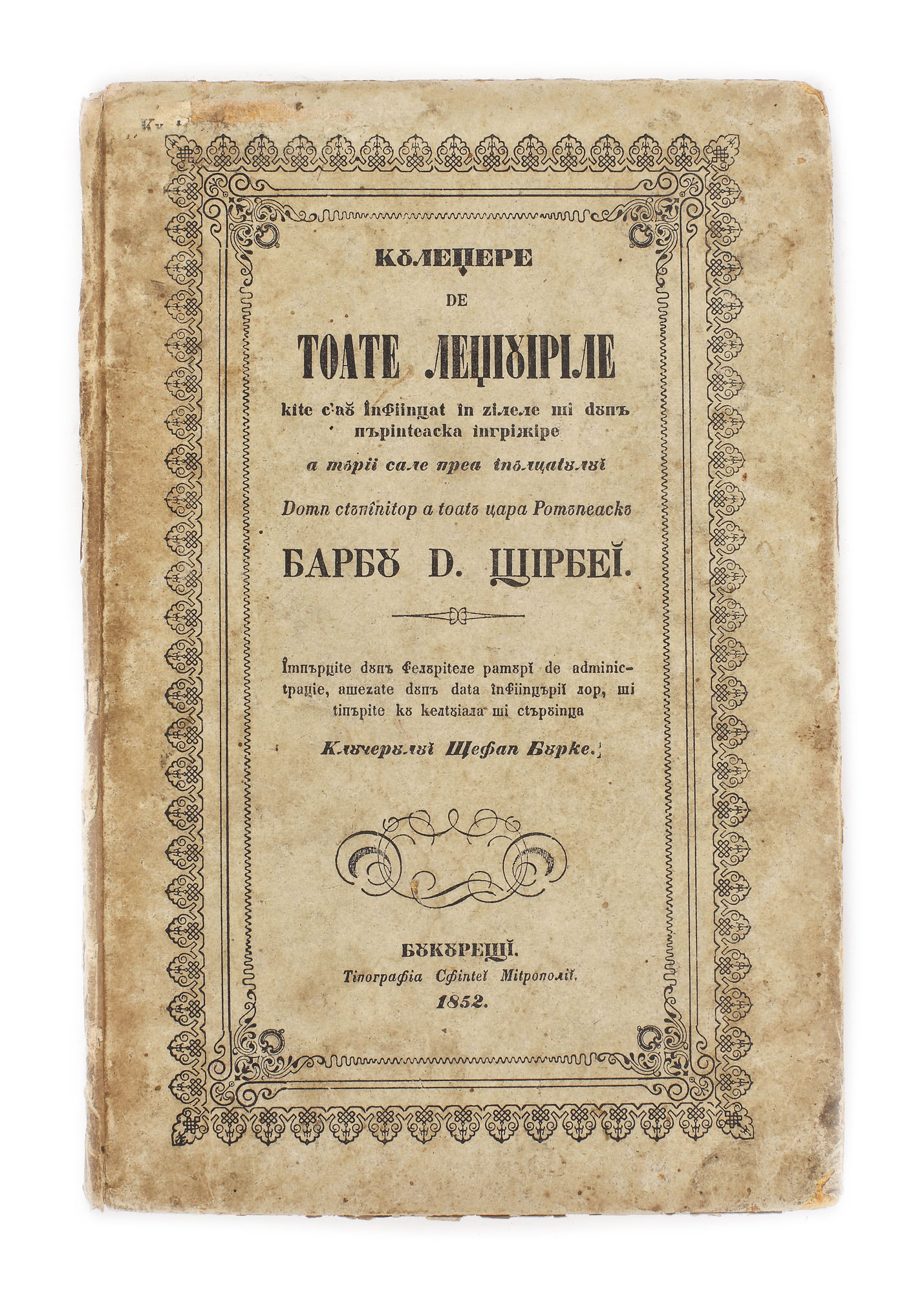 67. "Culegere de toate legiuirile câte s-au înfiinţat în zilele şi după părintească îngrijire a Mării Sale prea înălţatul Domn stăpînitor a toată Ţara Românească Barbu D. Ştirbei", tipărită cu "cheltuiala şi stăruinţa clucerului Ştefan Burce", București, 1853