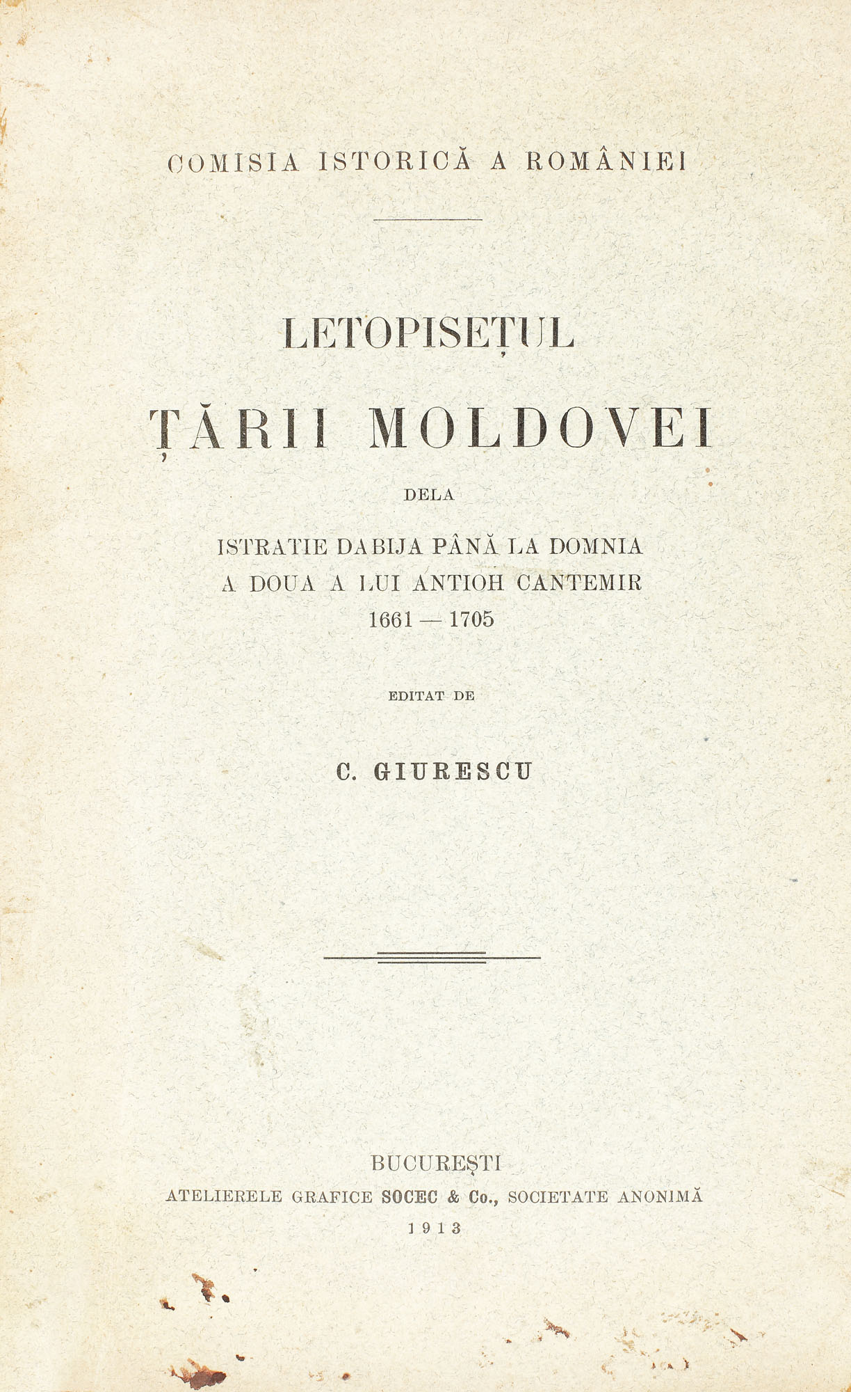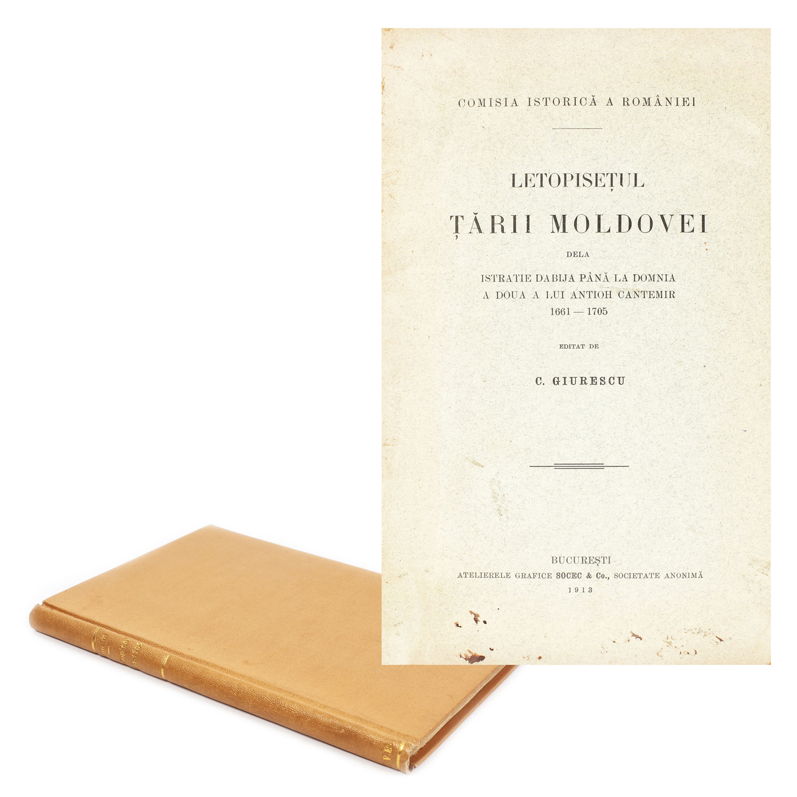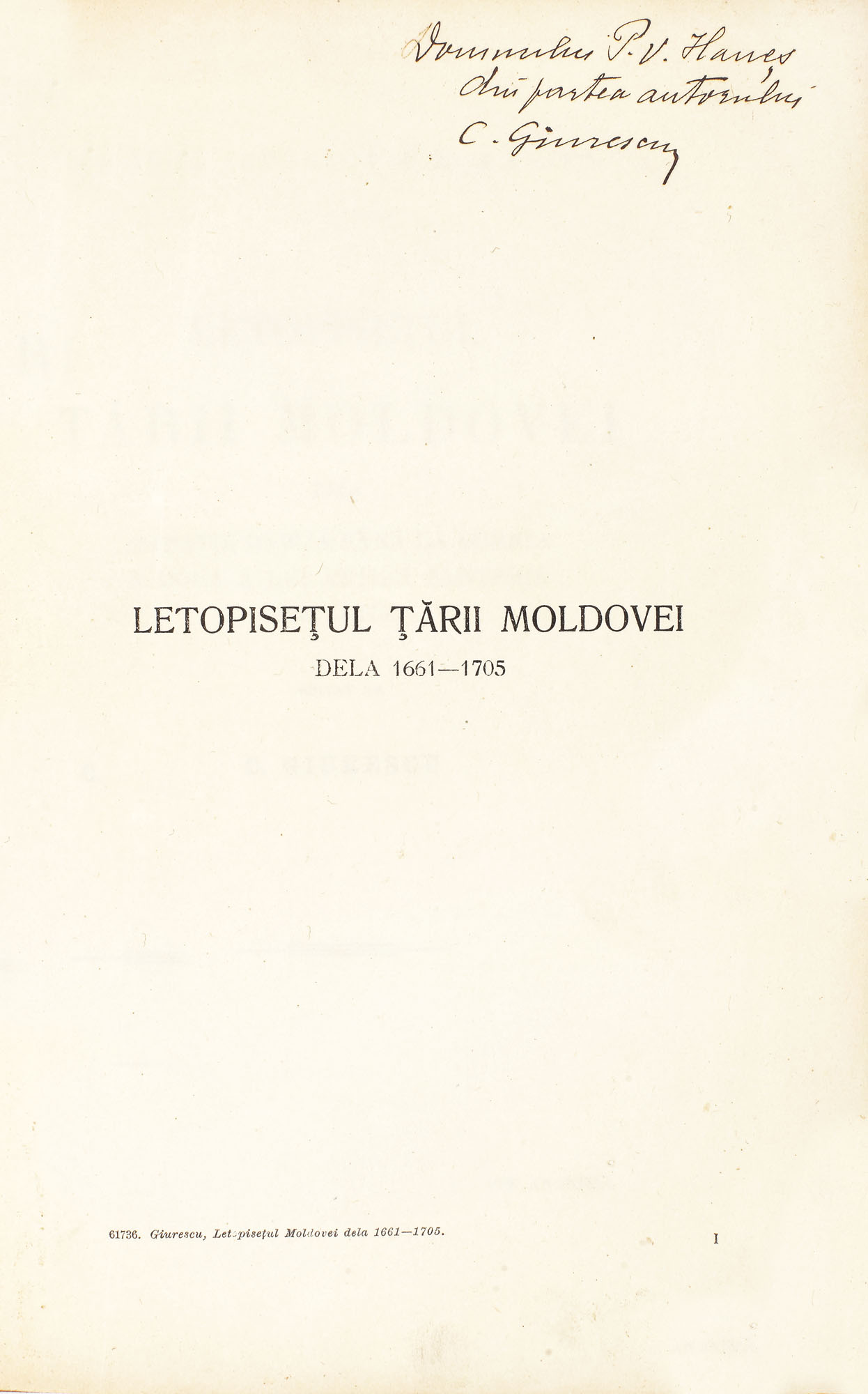 52. "Letopiseţul Ţării Moldovei", de Constantin Giurescu, cu dedicaţia şi semnătura olografă a autorului, Bucureşti, 1913