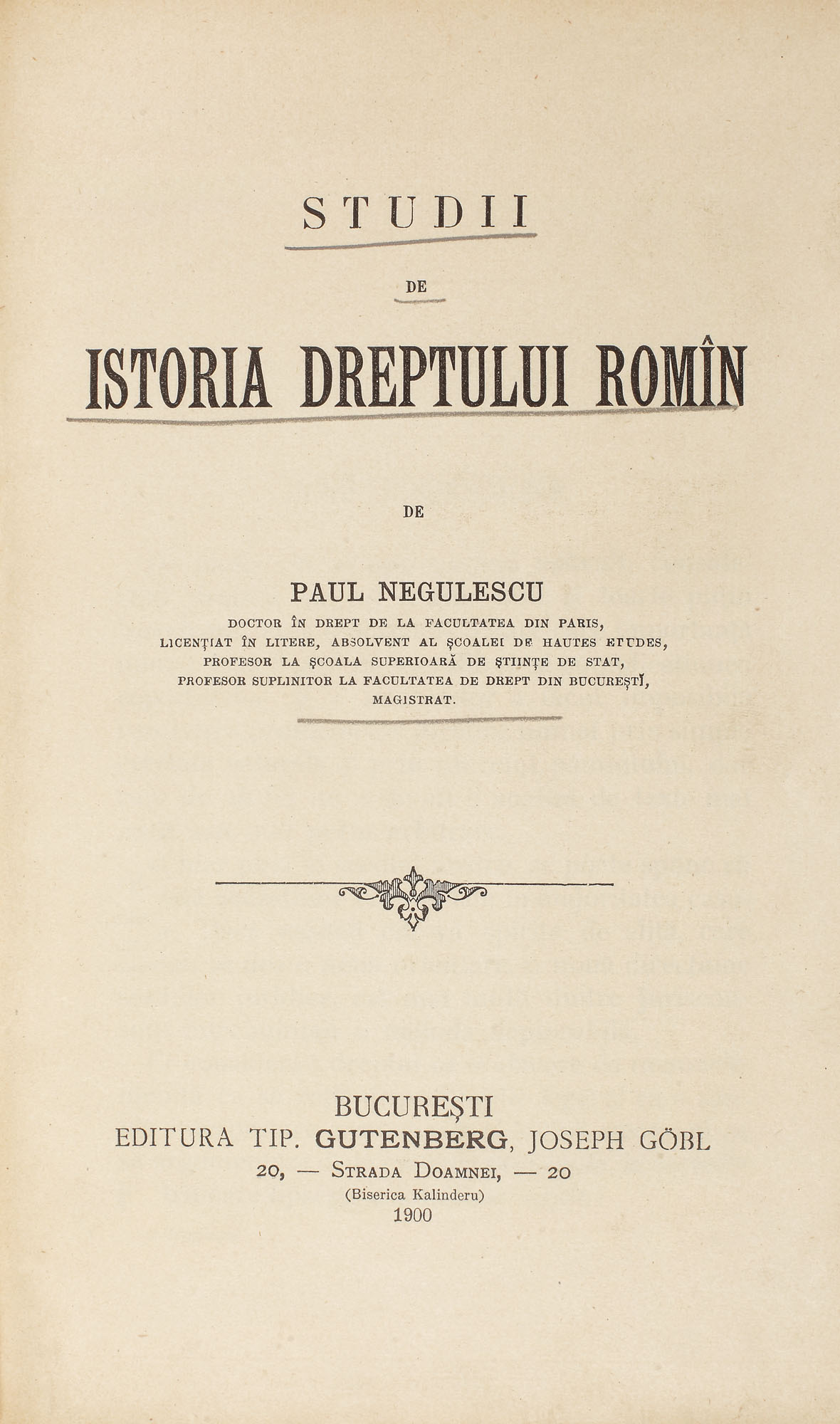 51. "Studii de istoria dreptului român", de Paul Negulescu, Bucureşti, 1900