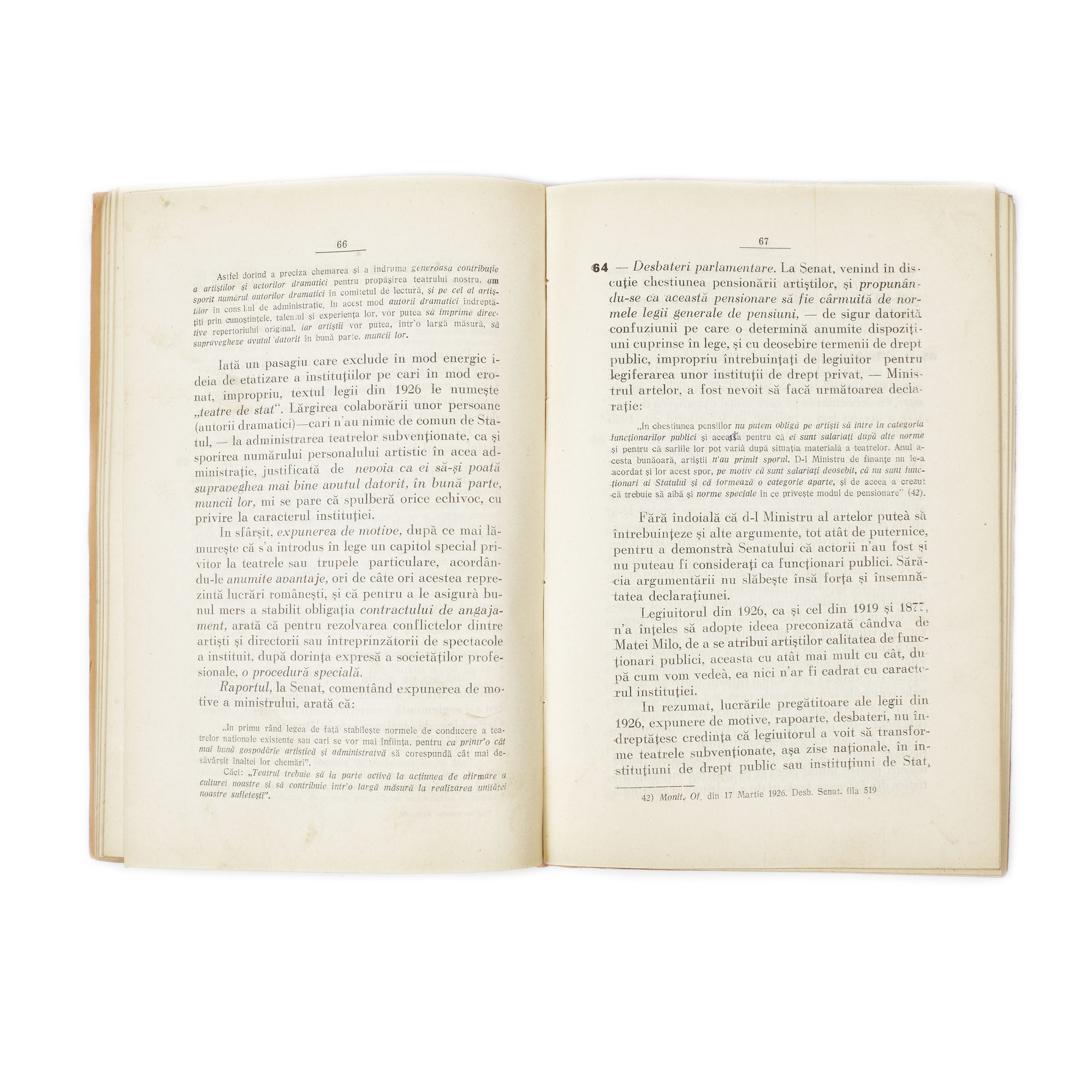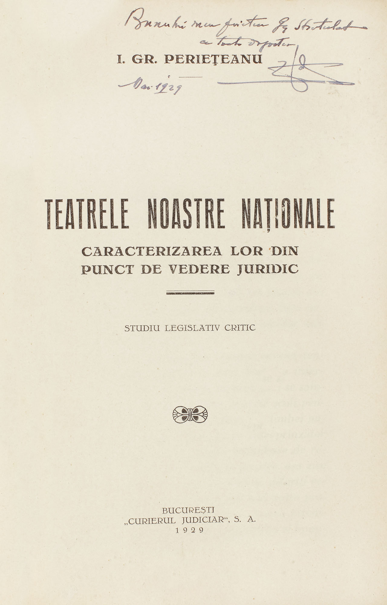 59. "Teatrele noastre naţionale, caracterizarea lor din punct de vedere juridic" de Ioan Gr. Perieţeanu, cu dedicaţia autorului către pictorul Gheorghe Stratulat, Bucureşti, 1929
