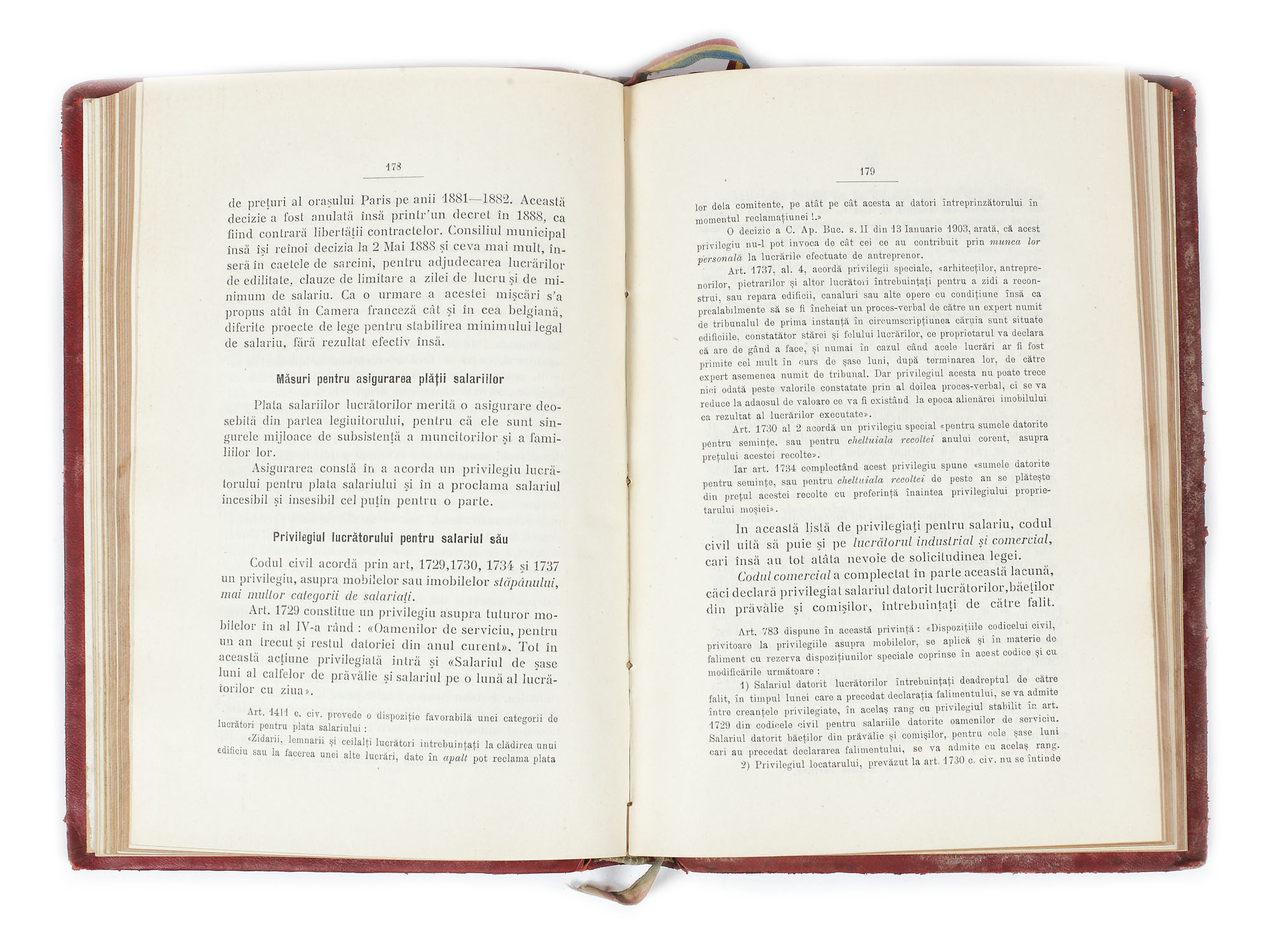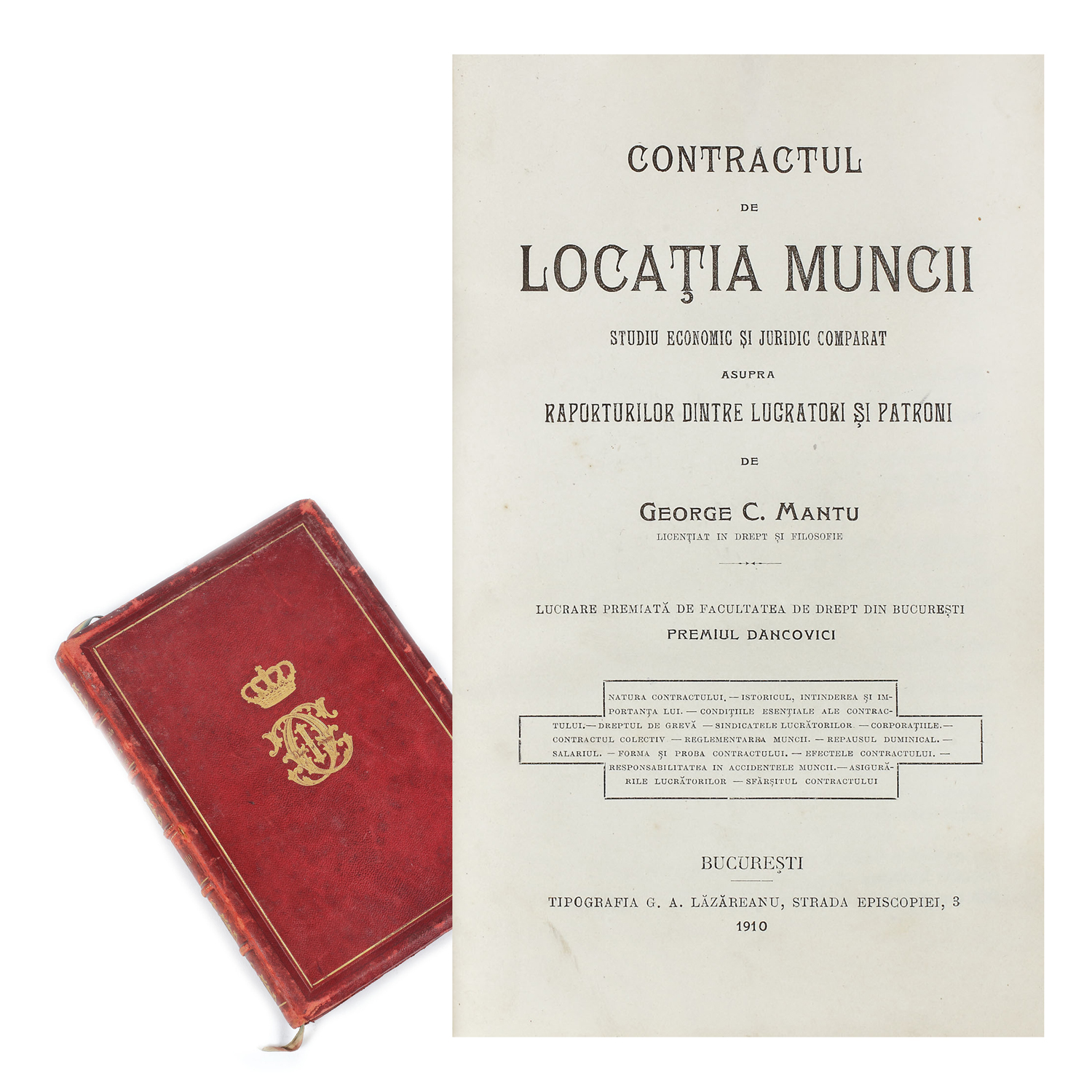 62. Tratat de dreptul muncii, "Contractul de locaţia muncii, studiu economic şi juridic comparat asupra raporturilor dintre lucrători şi patroni", de George C. Mantu, volumul este legat în piele, cu cifrul aurit al Regelui Carol I şi stema regală a României, București, 1910