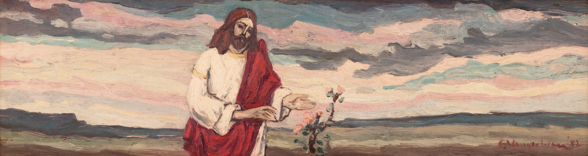 semnat și datat dreapta jos, cu roșu, "S. Vergulescu, (19)87"; intitulat și datat, pe verso, cu negru, ”Ocrotirea vameșului, 1987”