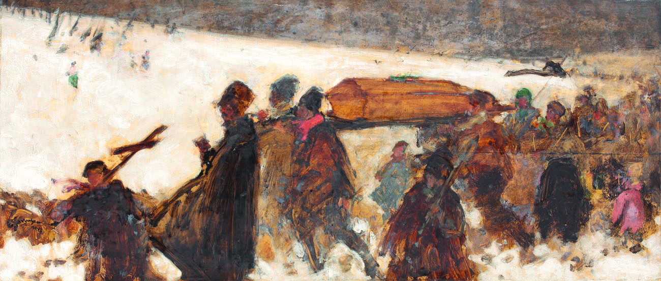 Opera este reprodusă în monografia "Eustațiu Stoenescu", George Oprescu, Ed. Casa Școalelor, București, 1946 la pag.173, cat. 87. Opera este reprodusă în monografia "Stoenescu", Paul Rezeanu, Ed. Meridiane, București, 1983 la cat. 37, sub titlul "Înmormântarea". Opera este reprodusă în monografia "Eustațiu Stoenescu", Paul Rezeanu, Ed. ARC-2000, București la cat. 28 și menționată la pag. 27.