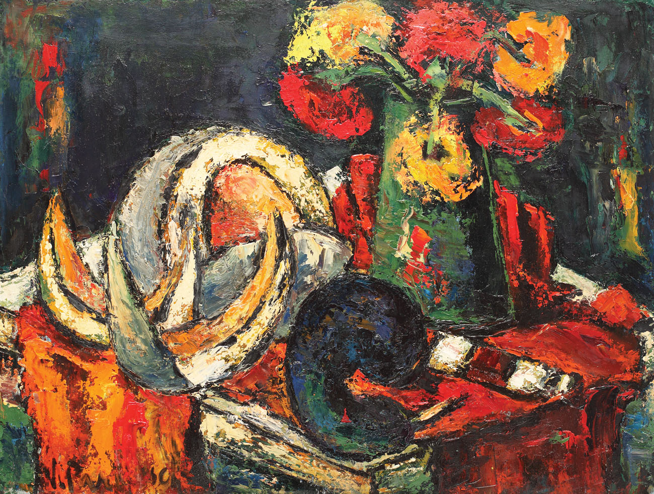 Scriere olografă: "N(atură) statică cu pepene galben, și o vânătă; cana cu flori întregește totul; pare o lucrare frumoasă, nu știu cum va fi", iulie 1991, V. Parizescu.