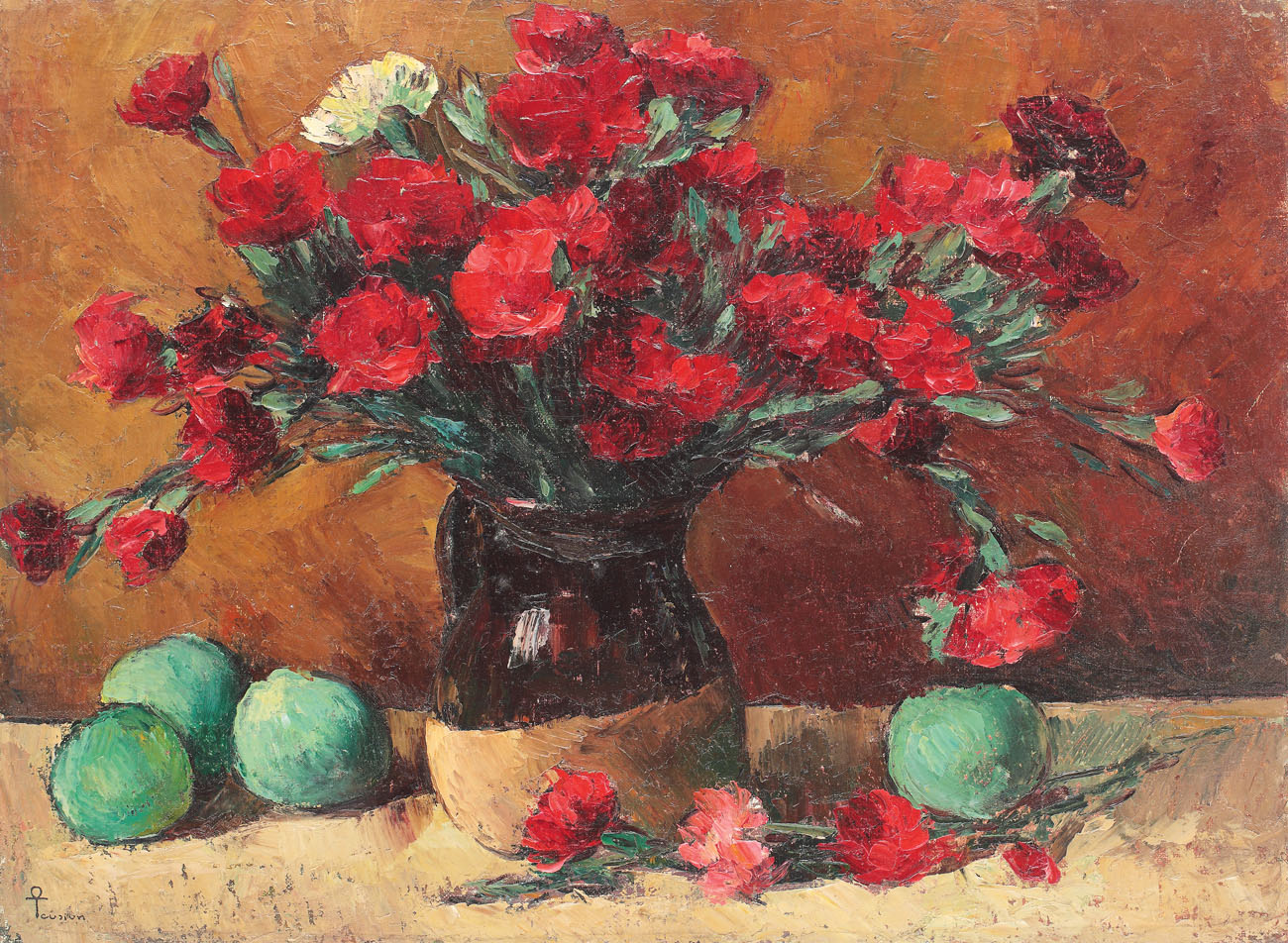69. Ulcică cu garoafe și mere verzi