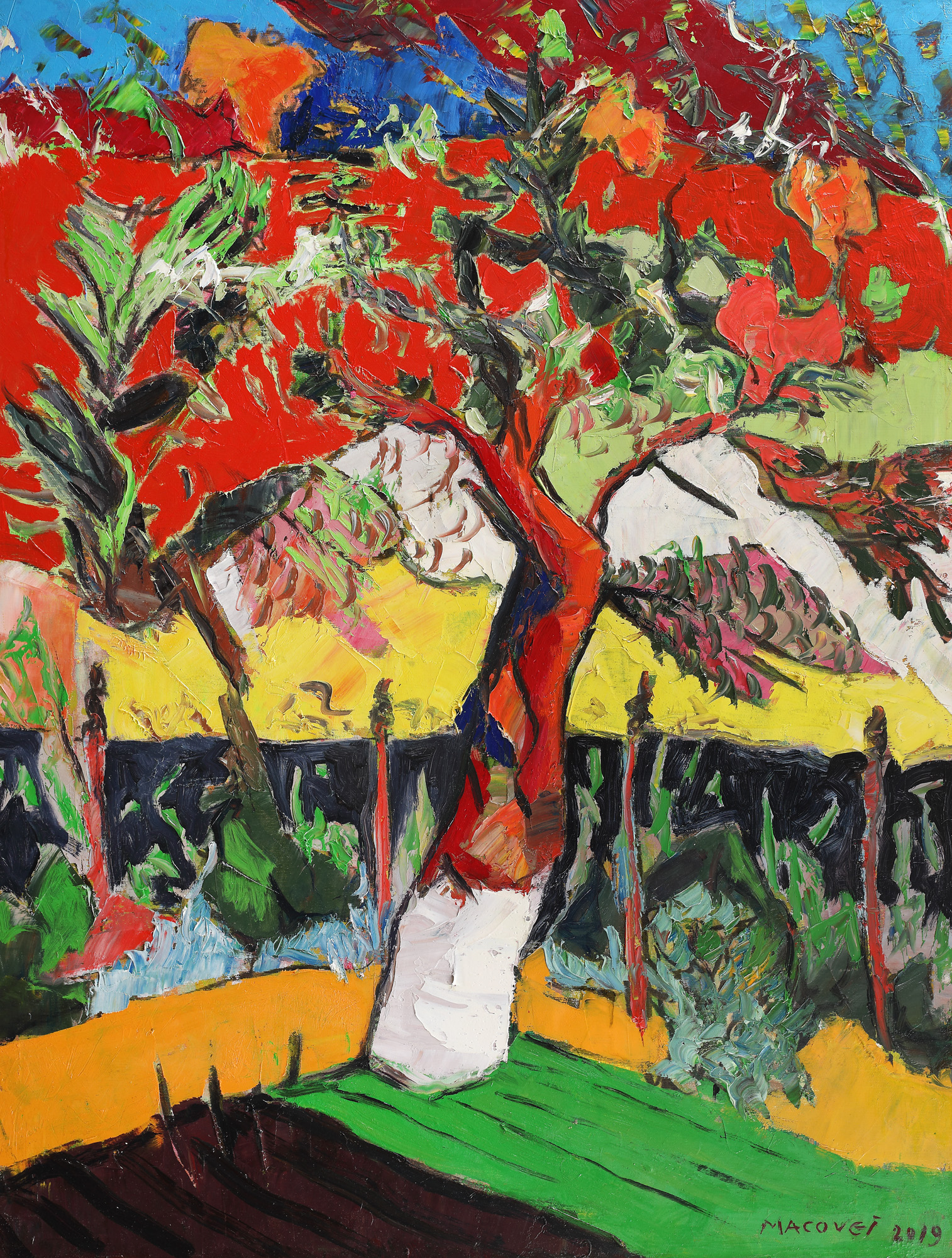 semnat și datat dreapta jos, cu negru, "Macovei, 2019"; semnat, datat și intitulat pe verso, cu negru, "Dumitru Macovei, Mărul roșu, 2019"