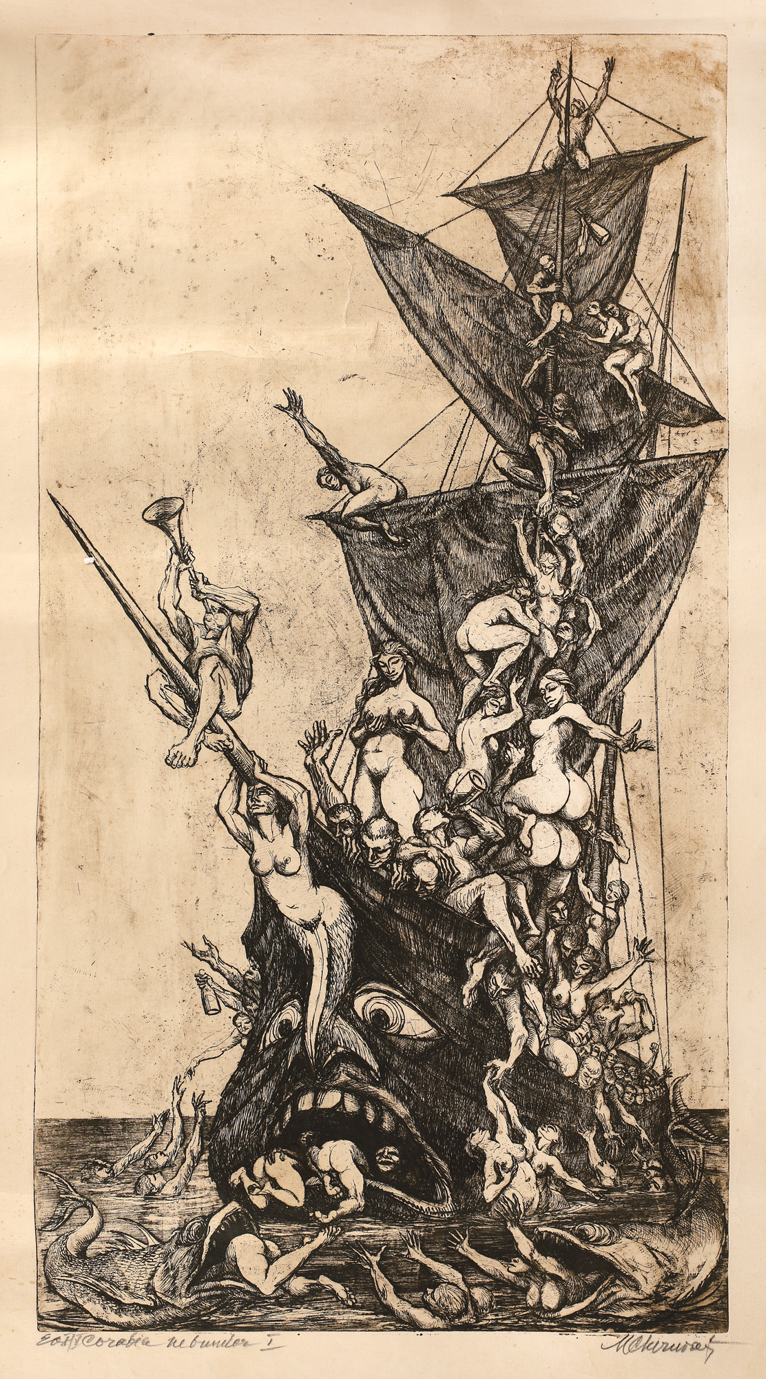 semnat dreapta jos, în creion, "M. Chirnoagă"; notat și intitulat stânga jos, în creion, "E.A, Corabia nebunilor"