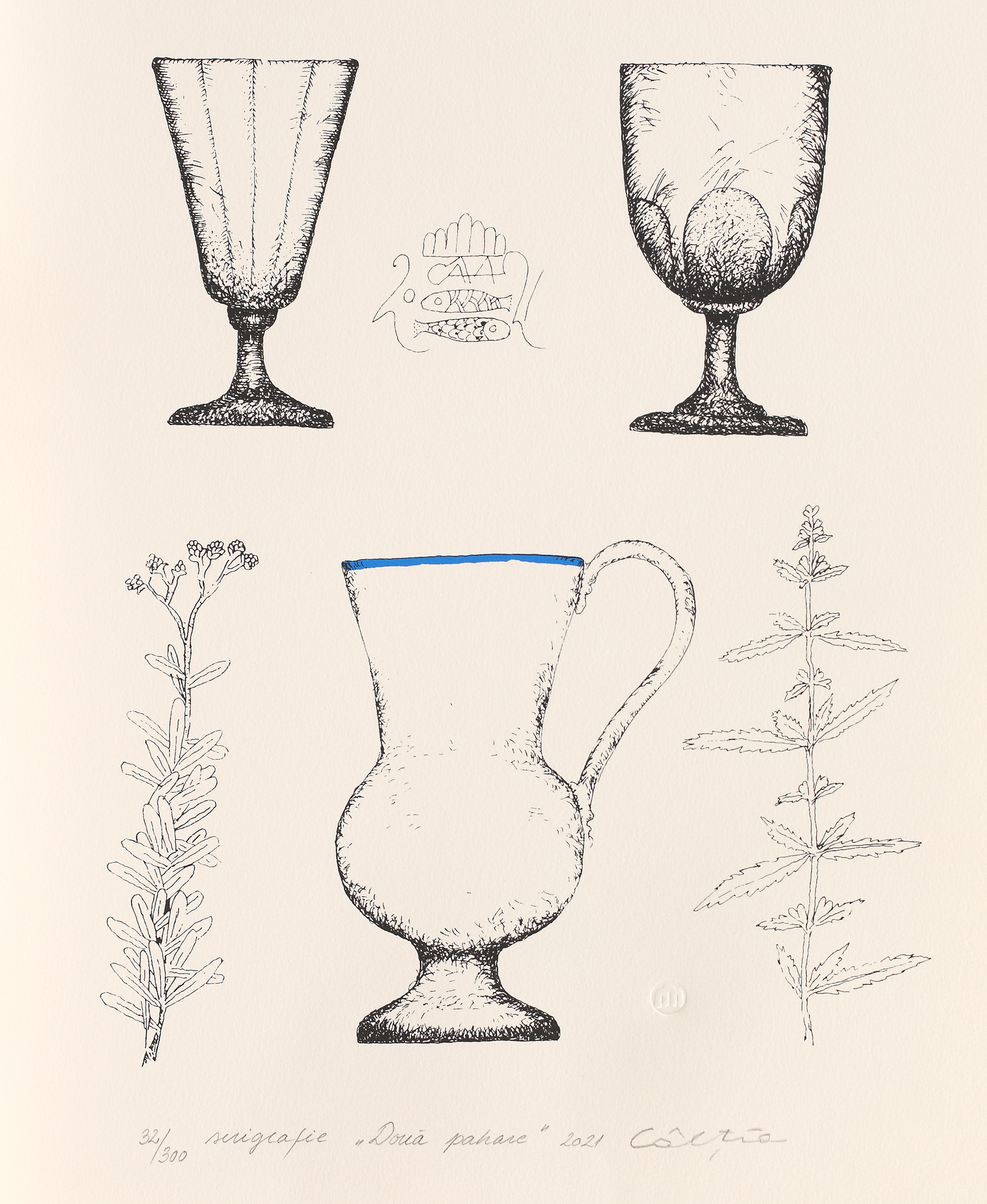 semnat, datat, intitulat și numerotat central jos, în creion, "Câlția, 2021, Două pahare, 32/ 300"
