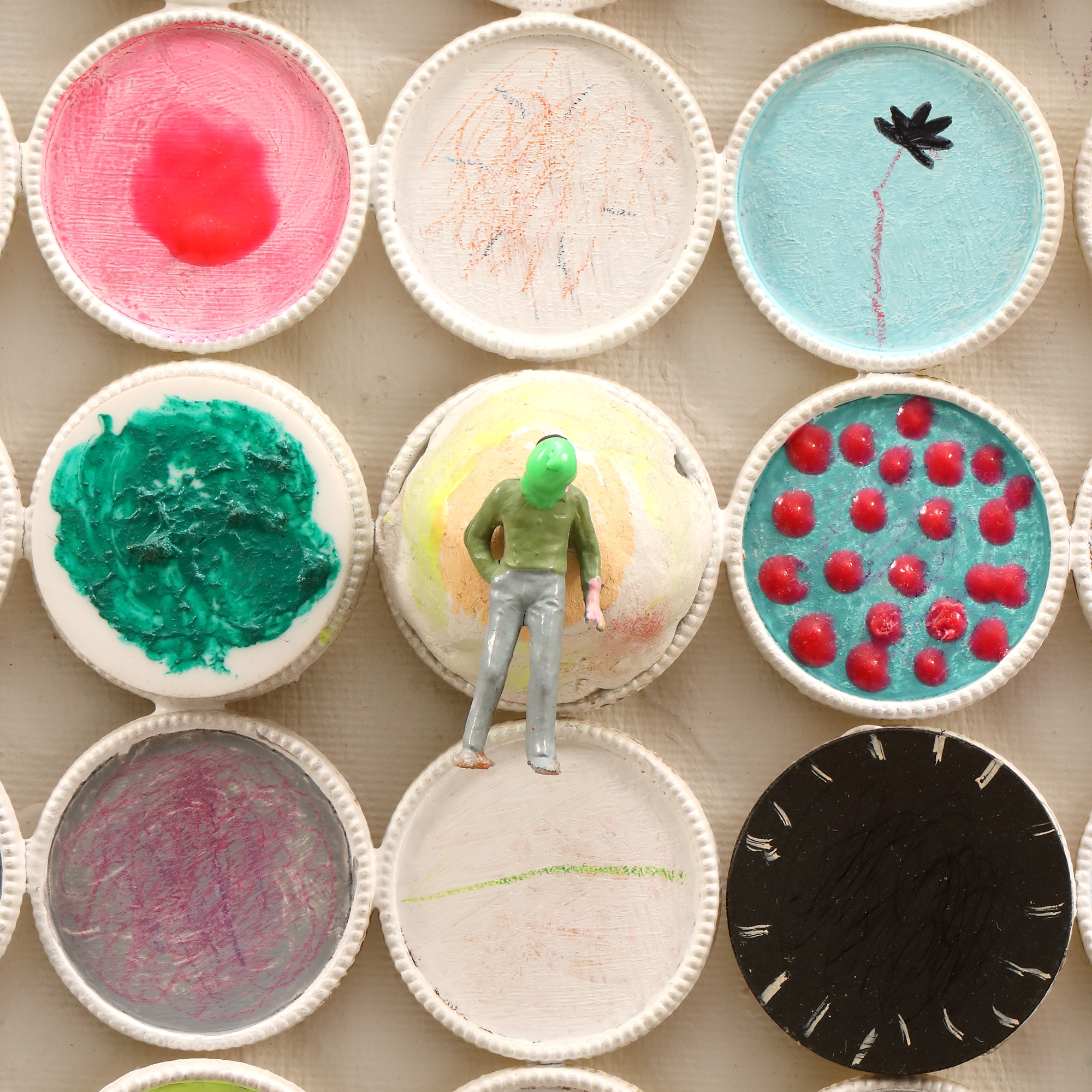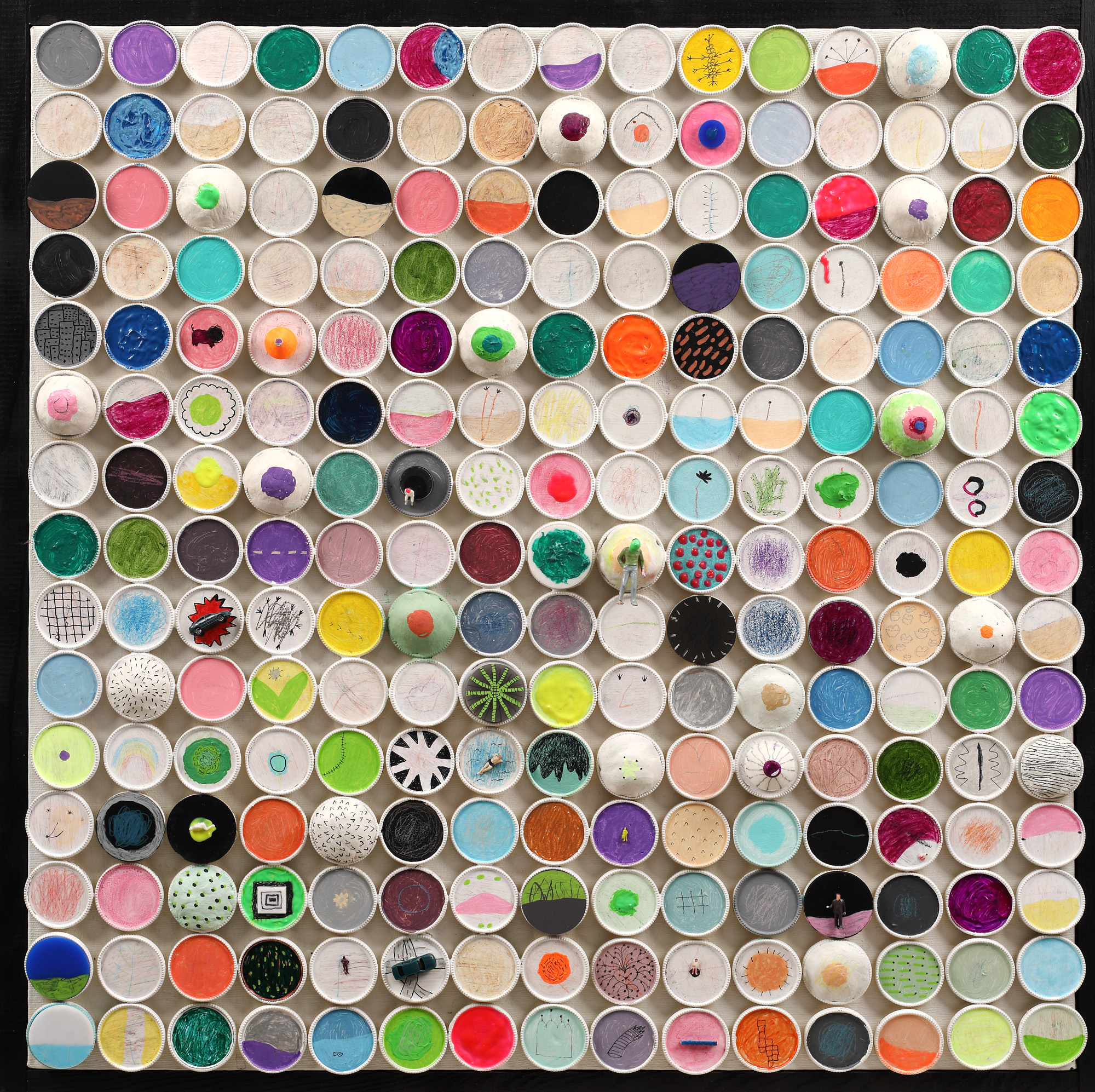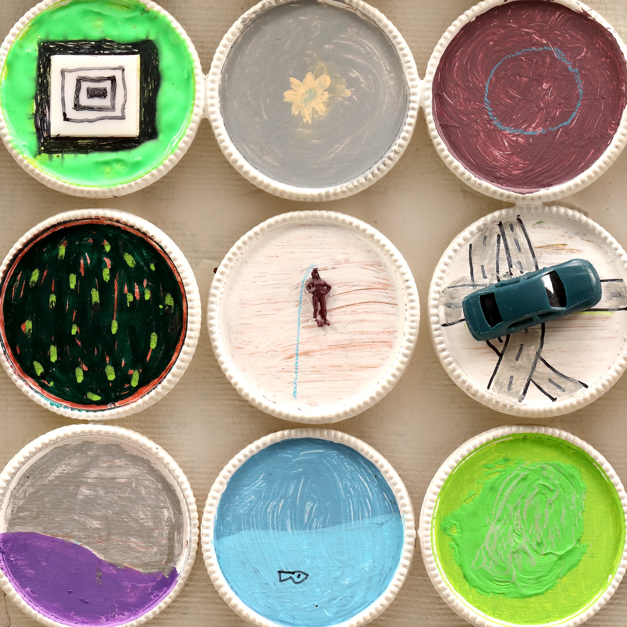 acrilic, markere, jucării Kinder, capace de tuburi de culori pe pânză