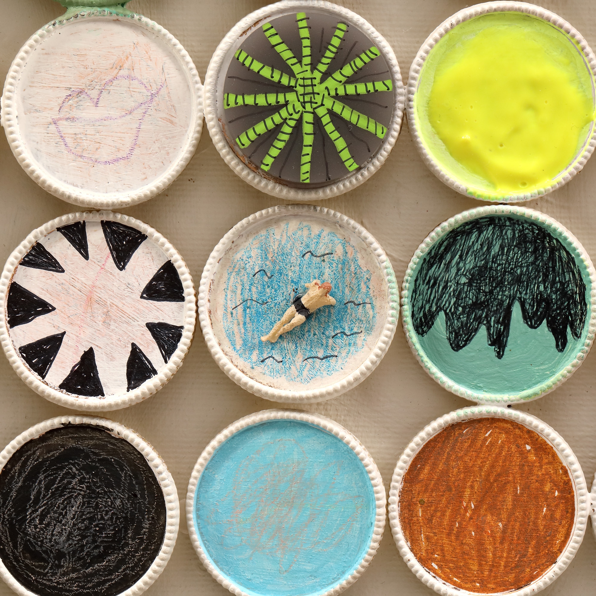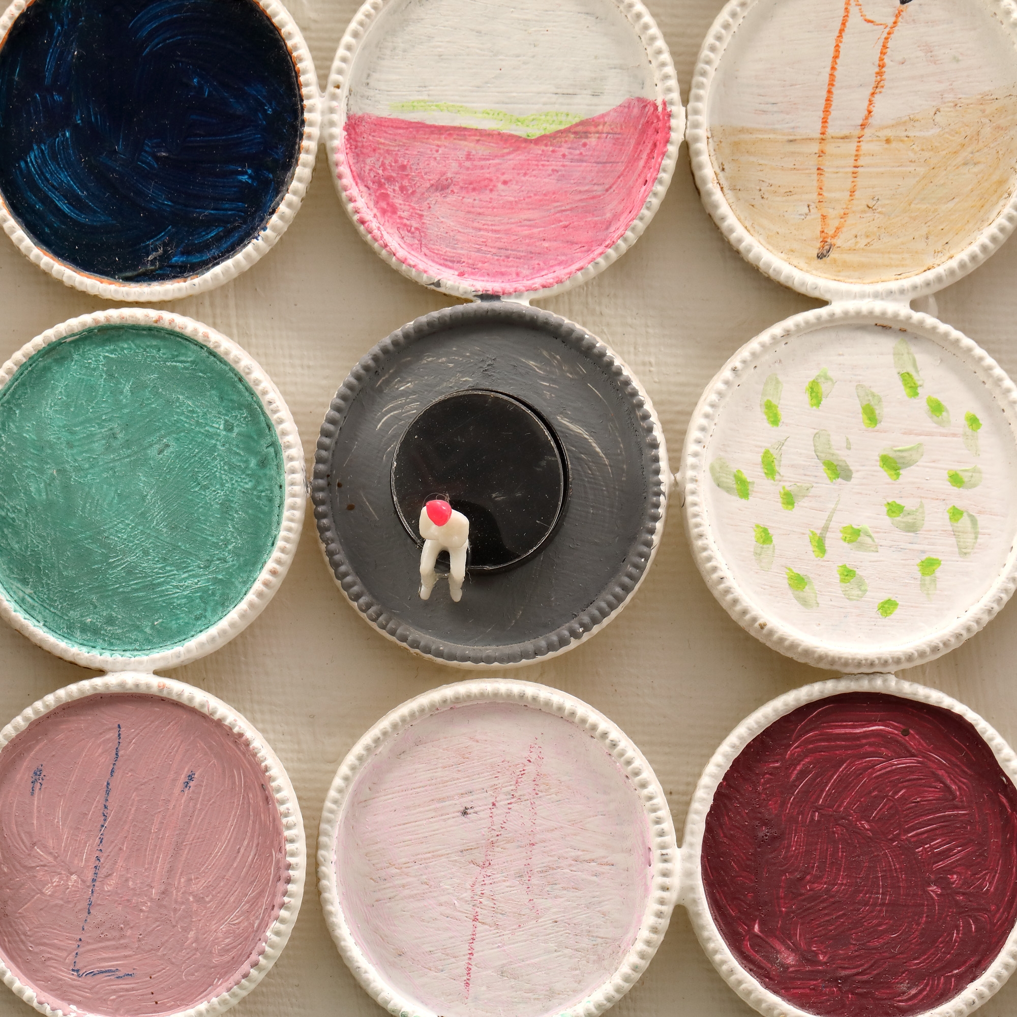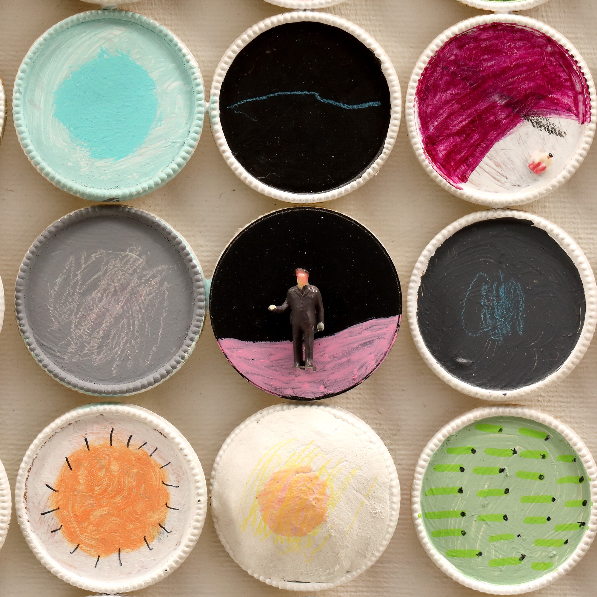 acrilic, markere, jucării Kinder, capace de tuburi de culori pe pânză