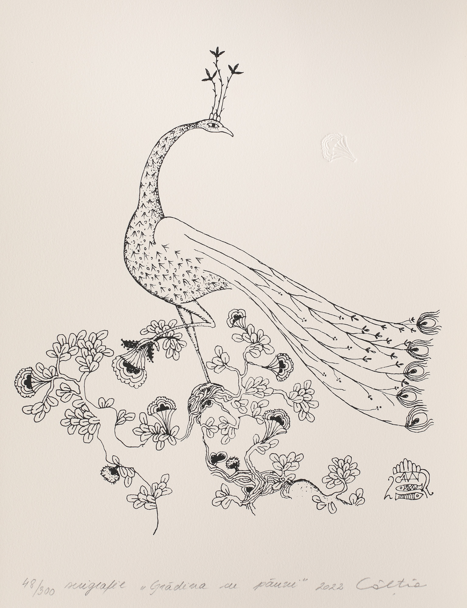 semnat, datat, intitulat și numerotat central jos, în creion, "Câlția, Grădina cu păuni, 2022, 48/ 300"