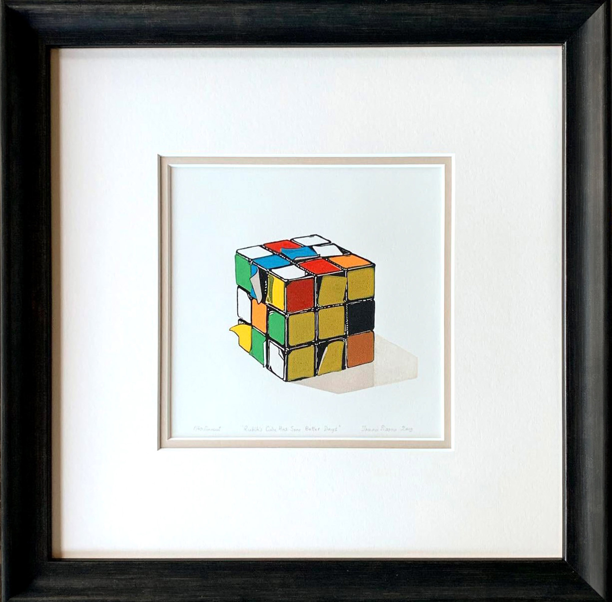 semnat și datat dreapta jos, în creion, "Ioana Pioaru, 2019", intitulat central jos, în creion, "Rubik’s Cube Has Seen Better Days"; numerotat și notat stânga jos, în creion, "1/ 40, linocut"