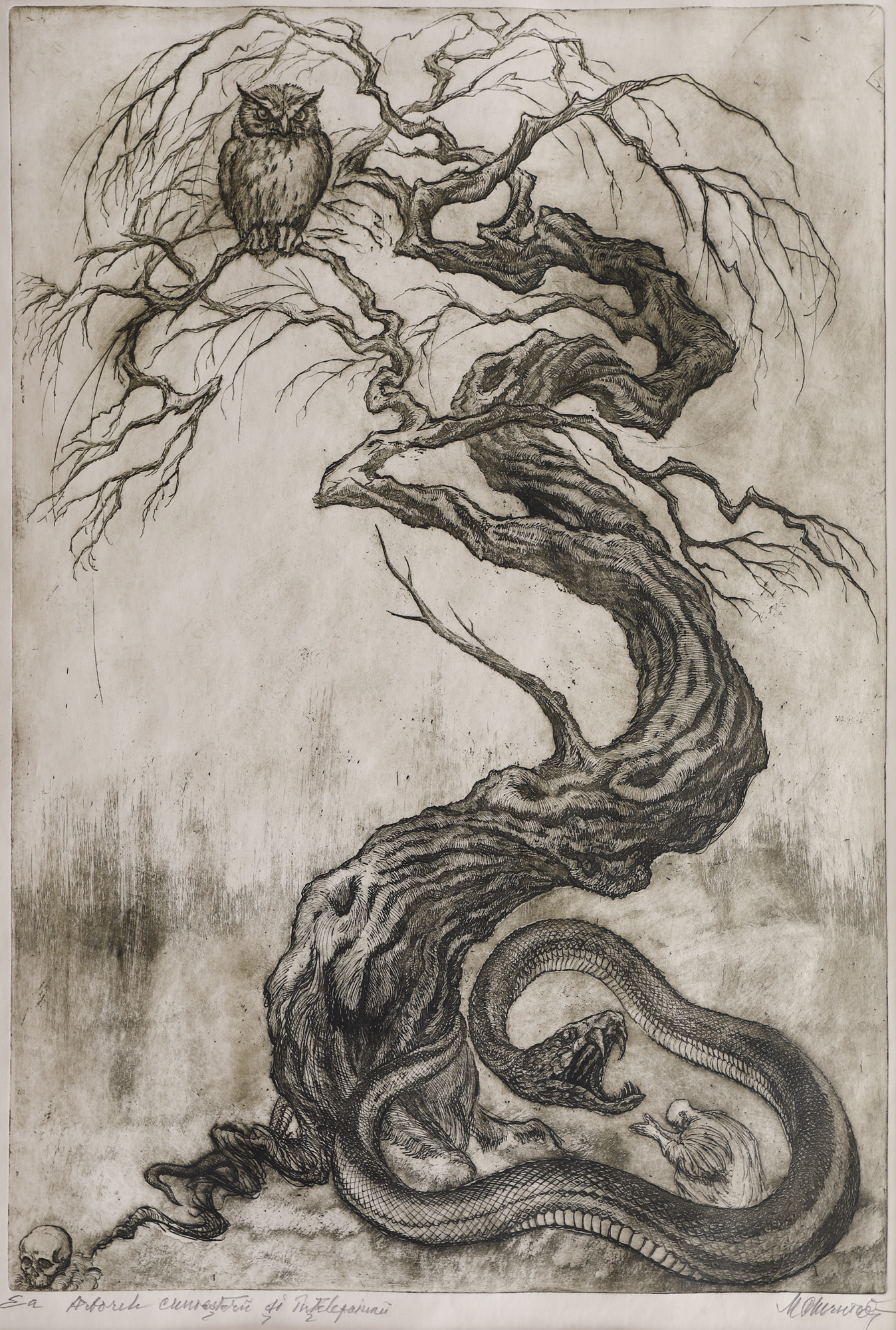semnat dreapta jos, în creion, "Chirnoagă"; notat și intitulat stânga jos, în creion, "E.A, Arborele cunoașterii și înțelepciunii"