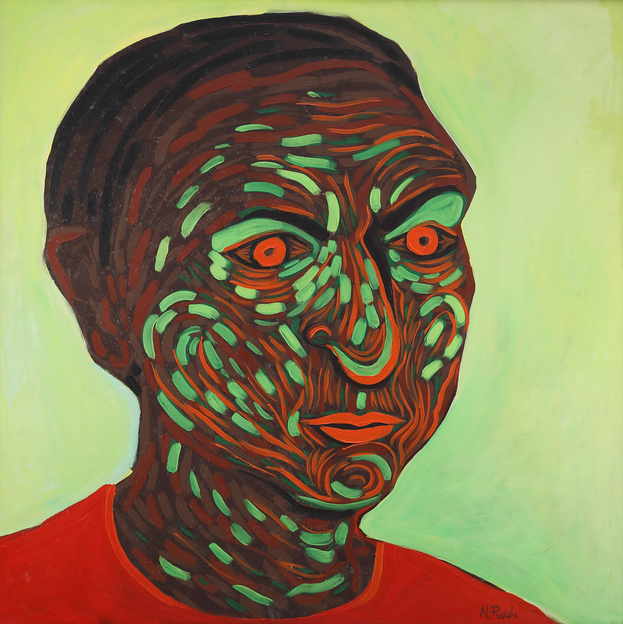 semnat dreapta jos, cu verde, ”N. Radu”; semnat, datat și intitulat pe verso, cu brun, "Nectaria Radu, Green Day, 2006"