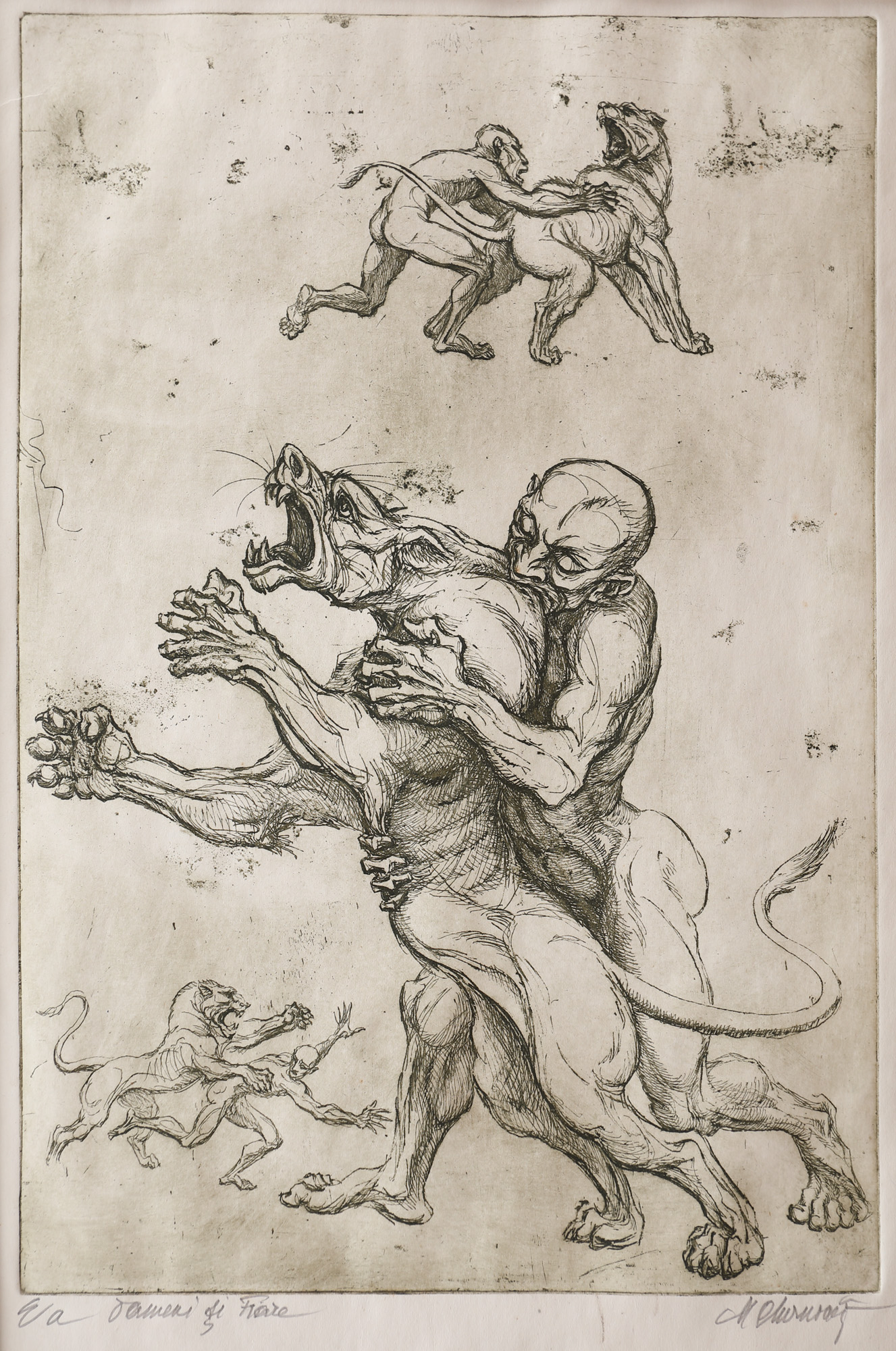 semnat dreapta jos, în creion, ”M. Chirnoagă”; notat și intitulat stânga jos, în creion, ”E.a, Oameni și fiare”