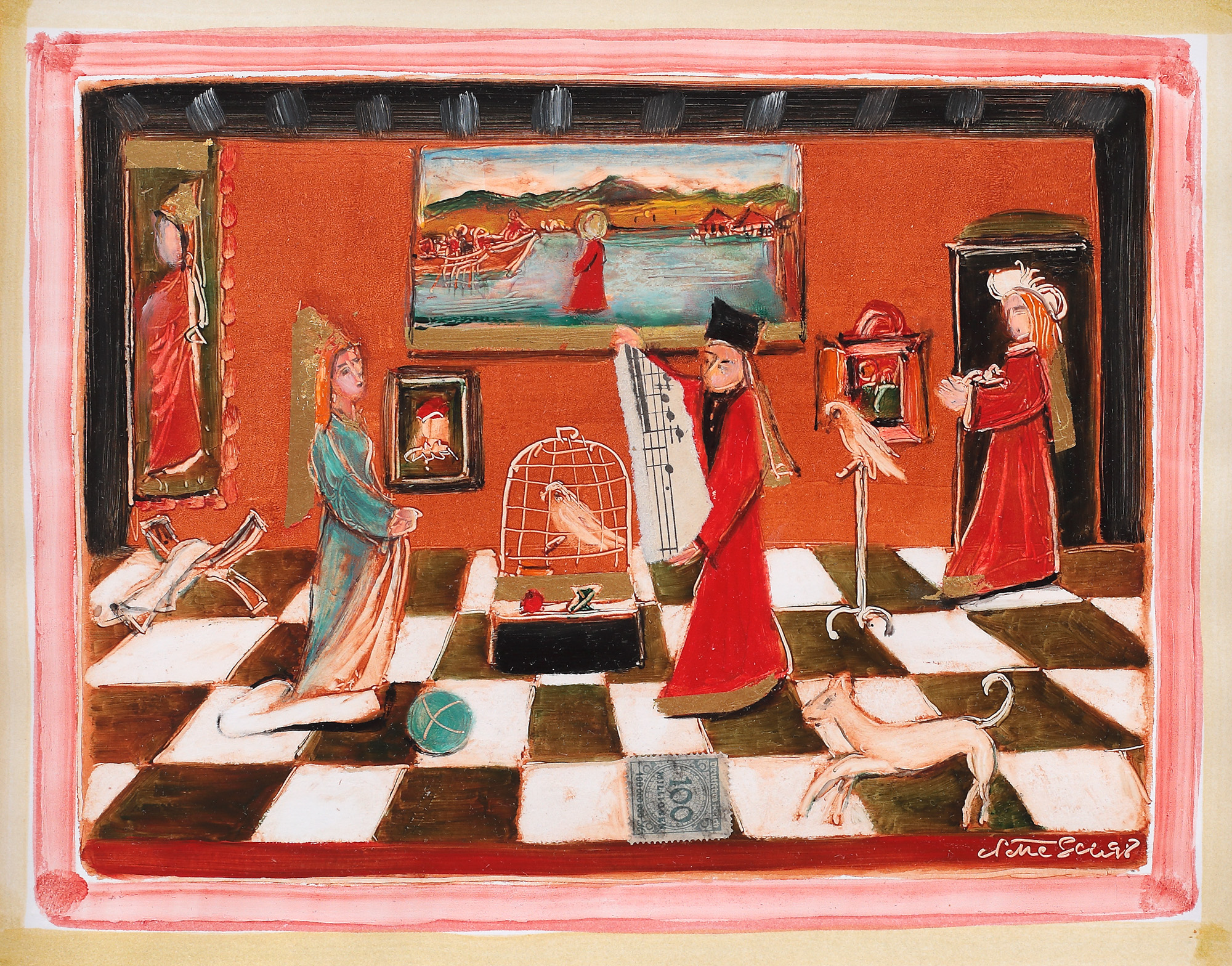 ulei, acrilic, colaj și foiță de aur pe carton