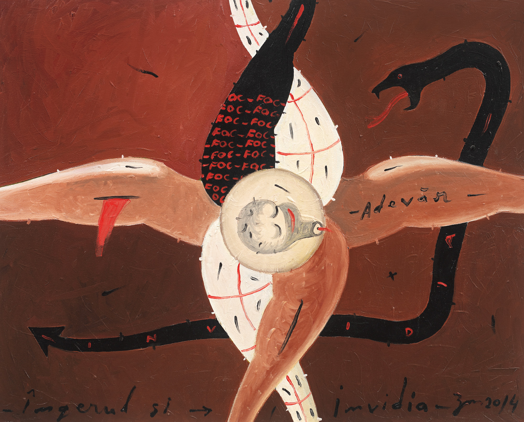 semnat, datat și intitulat central jos, cu negru, "ZM, 2014, Îngerul și invidia"