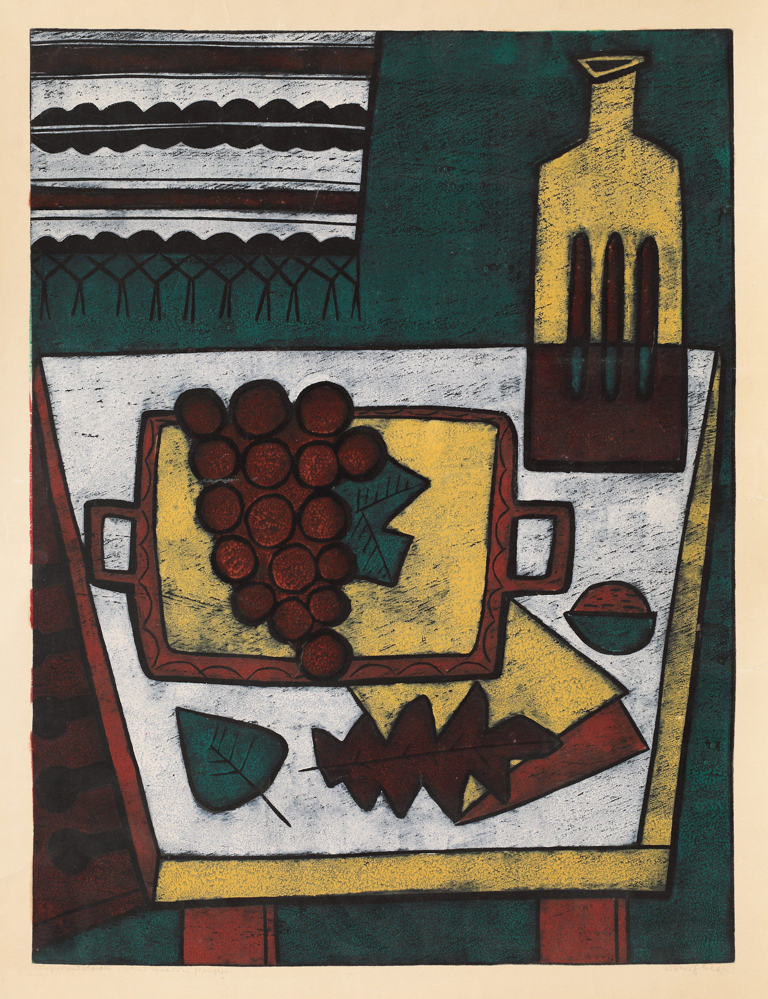 semnat și datat dreapta jos, în creion, "Petrescu, (19)64"; notat și intitulat stânga jos, în creion, "xilogravură colorată, Natură moartă cu struguri"