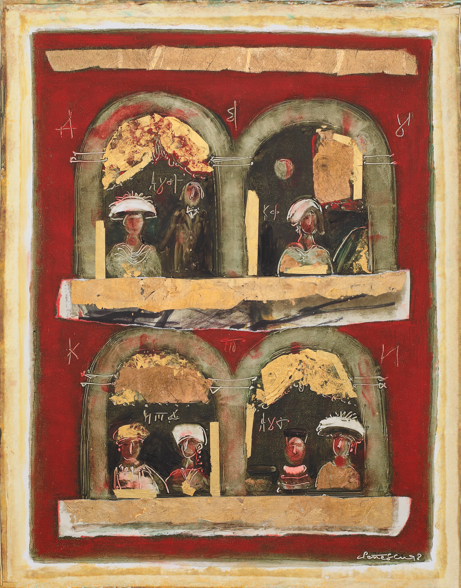 ulei, acrilic, colaj și foiță de aur pe carton