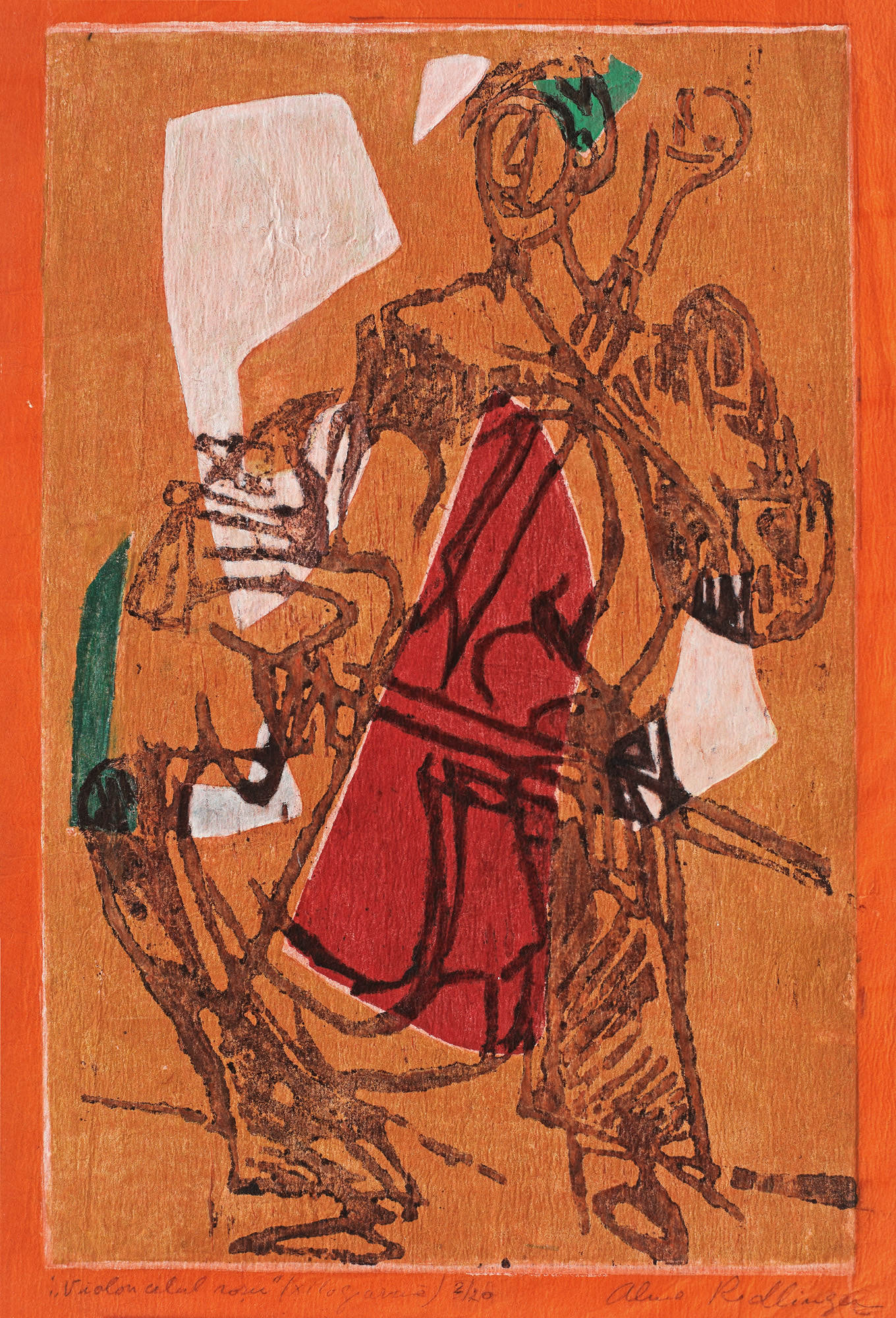 semnat dreapta jos, în creion, "Alma Redlinger"; intitulat și numerotat stânga jos, în creion, "Violoncelul roșu, 2/20"