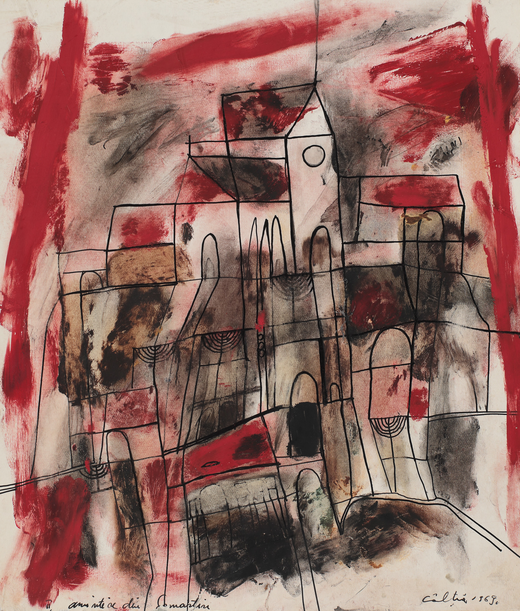 semnat și datat dreapta jos, cu negru, "Câlția, 1969"; intitulat stânga jos, cu negru, "Amintiri din Șomartin"