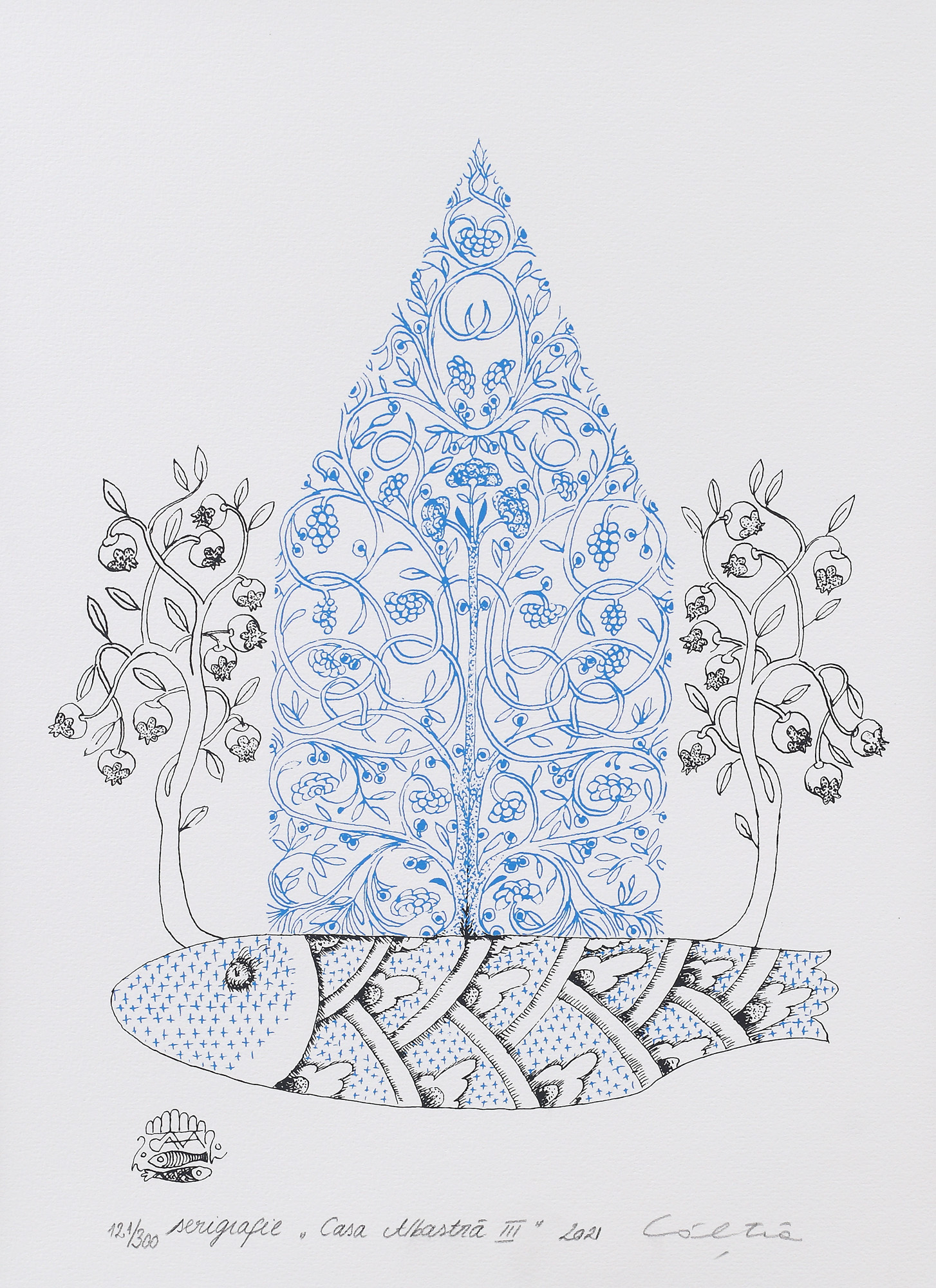 semnat, datat, intitulat, numerotat și notat central jos, în creion, "Șt. Câlția, 2021, Casa albastră III, 121/ 300, serigrafie"