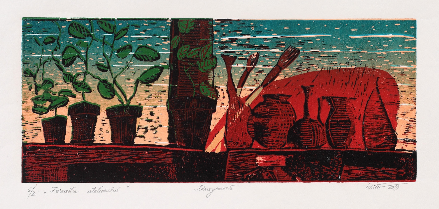 semnat și datat dreapta jos, în creion, "Valter, 2019"; intitulat și numerotat stânga jos, în creion, "Fereastra atelierului, 6/20"