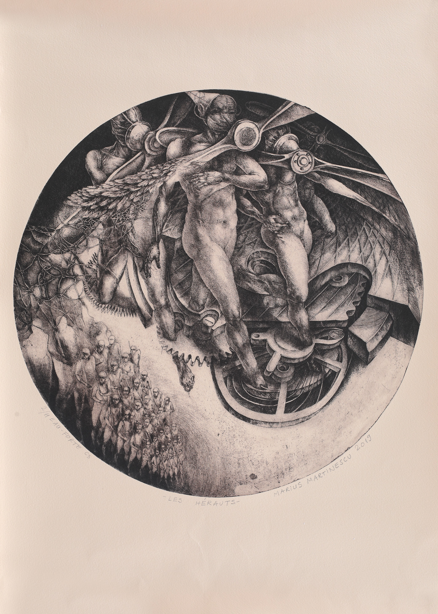 semnat, datat, intitulat, numerotat și notat central jos, în creion, "Marius Martinescu, 2019, Les Herauts, 2/11, eau-forte, C3"