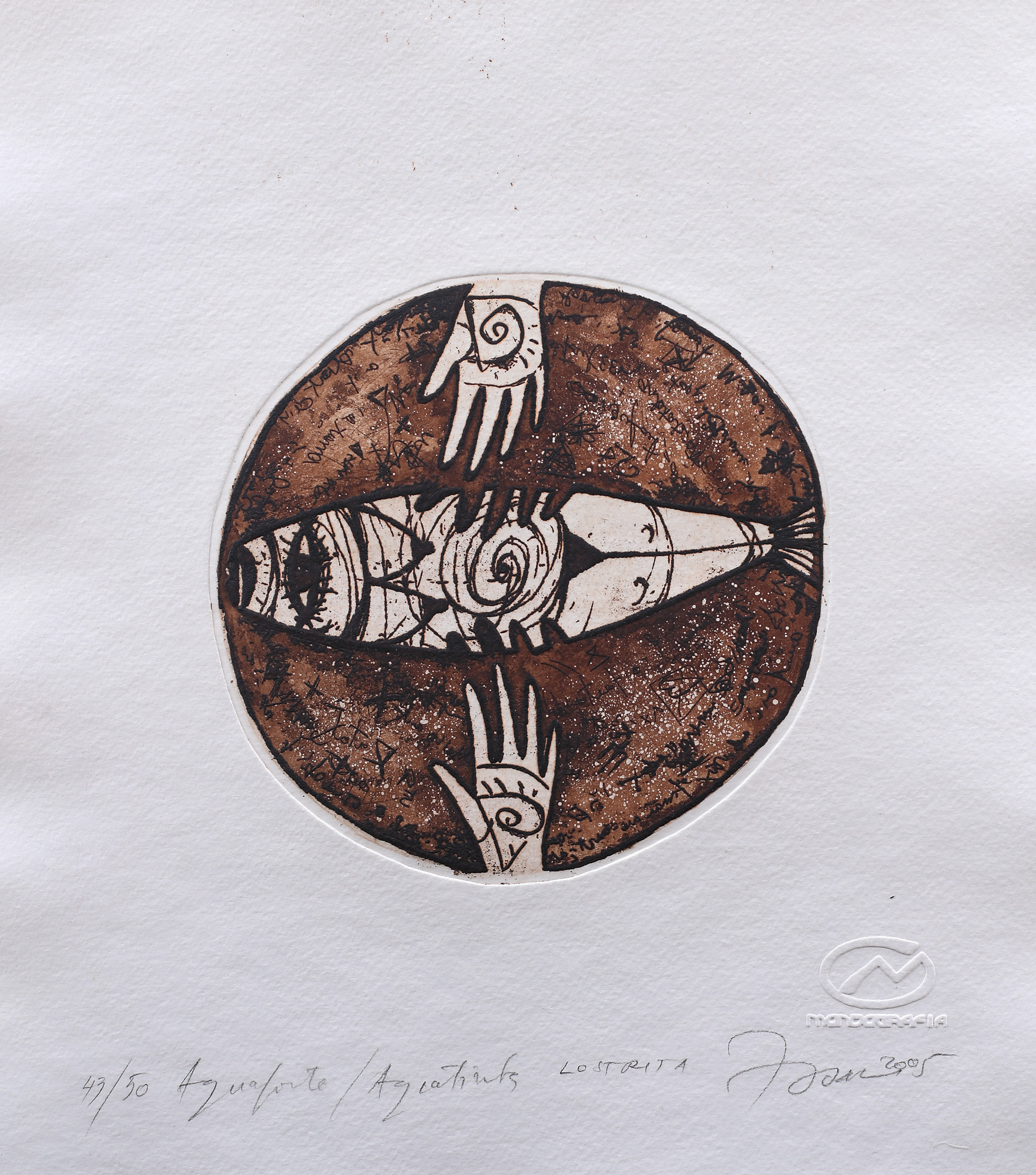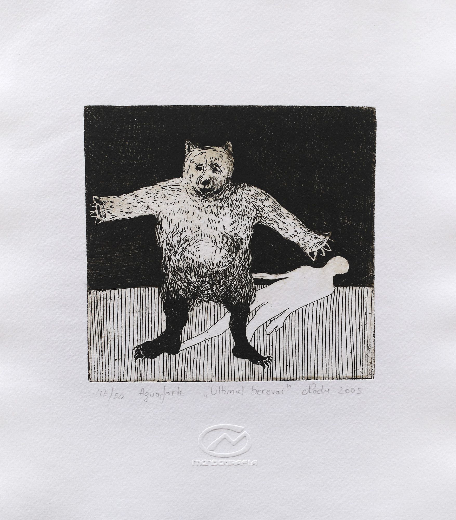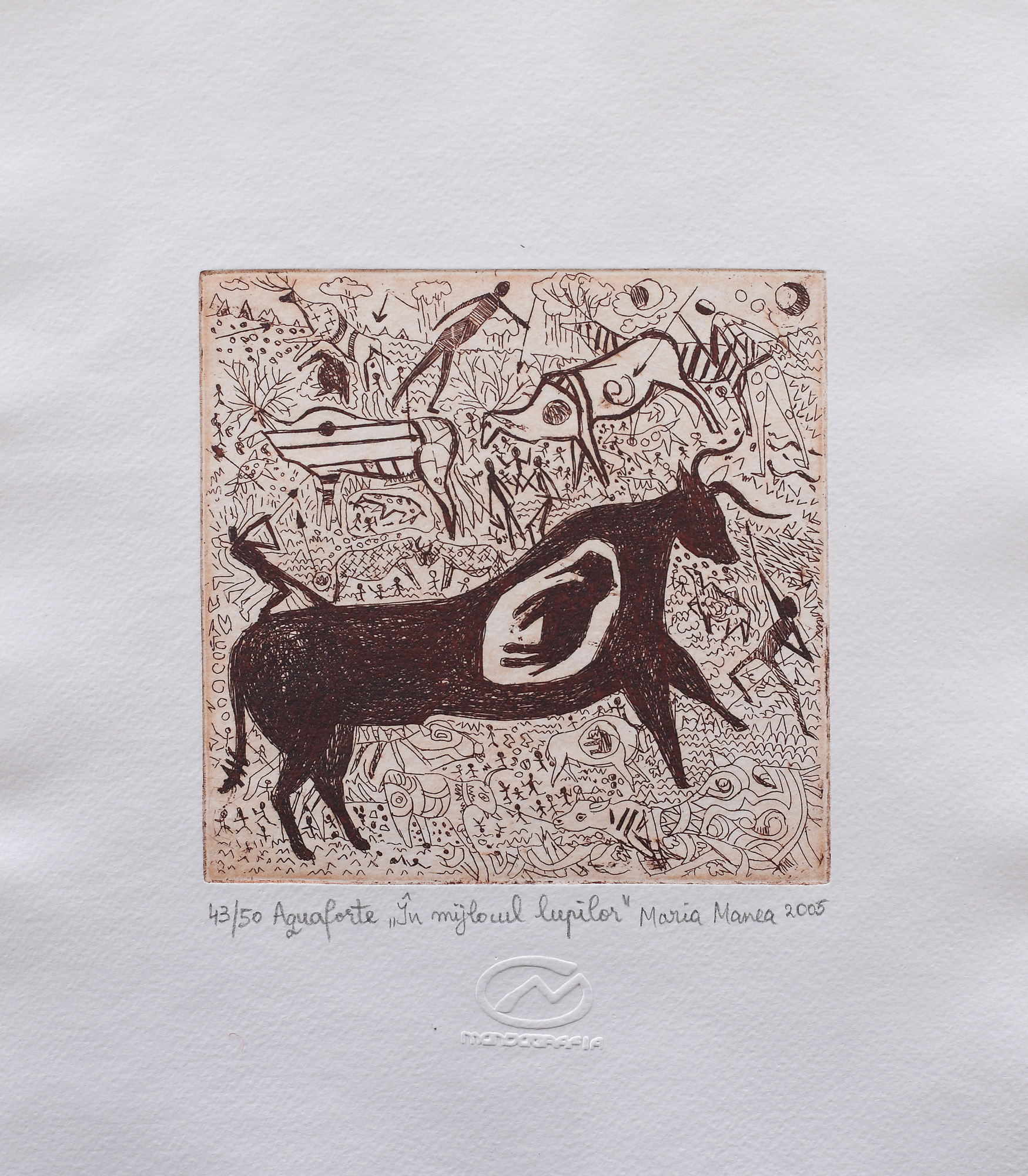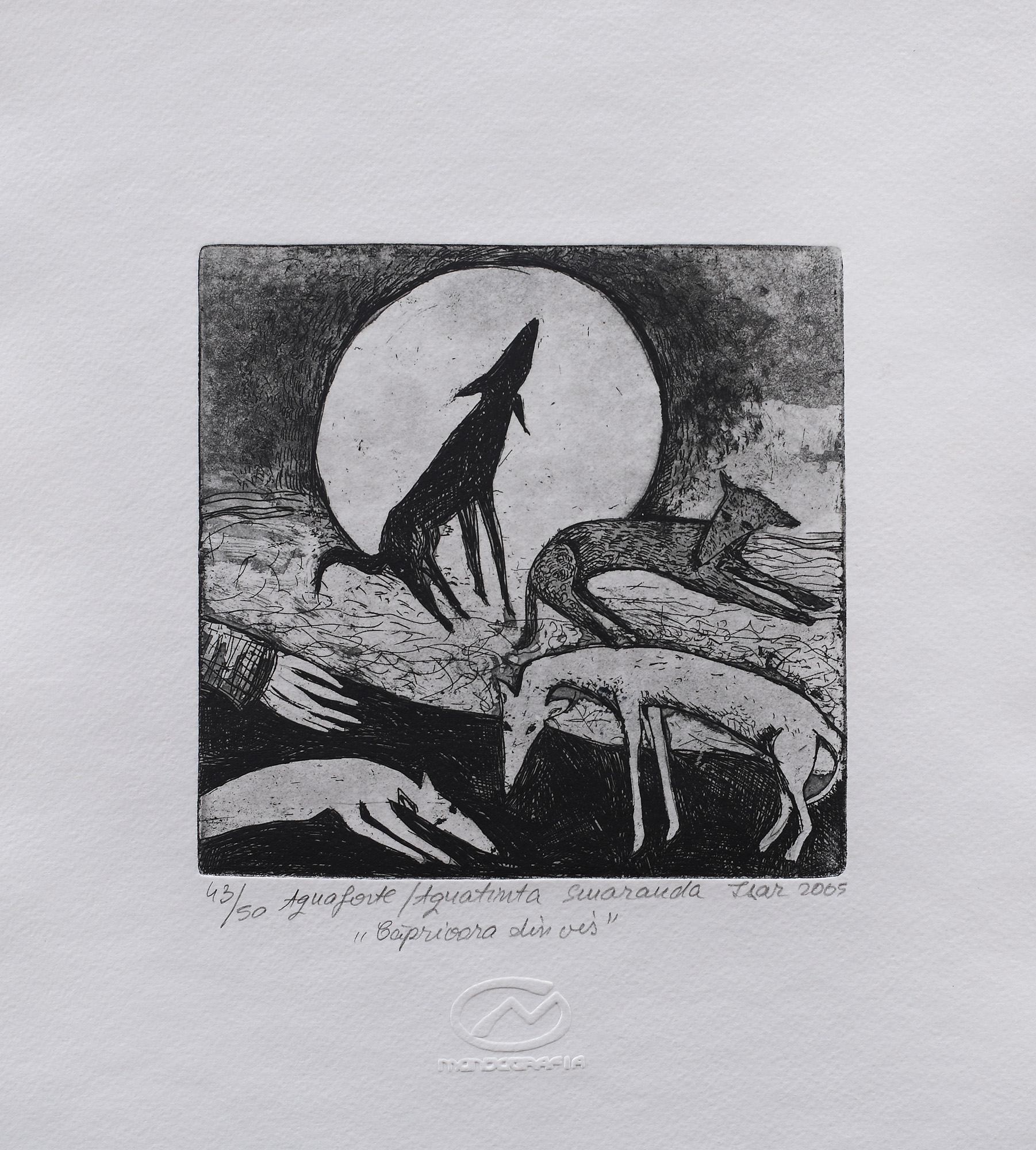 1.semnat, datat, intitulat și numerotat central jos, în creion, "Isar, 2005, Lostrița, 43/50"; 2. semnat, datat, intitulat și numerotat central jos, în creion, "George Bordeanu, 2005, Capul de zimbru, 43/50"; 3. semnat, datat, intitulat și numerotat central jos, în creion, "Smaranda Isar, 2005, Căprioara din vis, 43/50"; 4. semnat, datat, intitulat și numerotat central jos, în creion, "Ionuț Popa, Locul rău, 2005, 43/50"; 5. semnat, datat, intitulat și numerotat central jos, în creion, "Maria Manea, 2005, În mijlocul lupilor, 43/50"; 6. semnat, datat, intitulat și numerotat central jos, în creion, "Oana Isar, 2005, Pescarul Amin, 43/50"; 7. semnat, datat, intitulat și numerotat central jos, în creion, "Anca Popescu, 2005, Chef în mănăstire, 43/50"; 8. semnat, datat, intitulat și numerotat central jos, în creion, "Camelia Neață, 2005, Taina gorunului 43/50"; 9. semnat, datat, intitulat și numerotat central jos, în creion, "N. Radu, 2005, Ultimul berevoi, 43/50"; 10. semnat, datat, intitulat și numerotat central jos, în creion, "Ciprian, 2005, Ispitele părintelui Evdichie, 43/50"