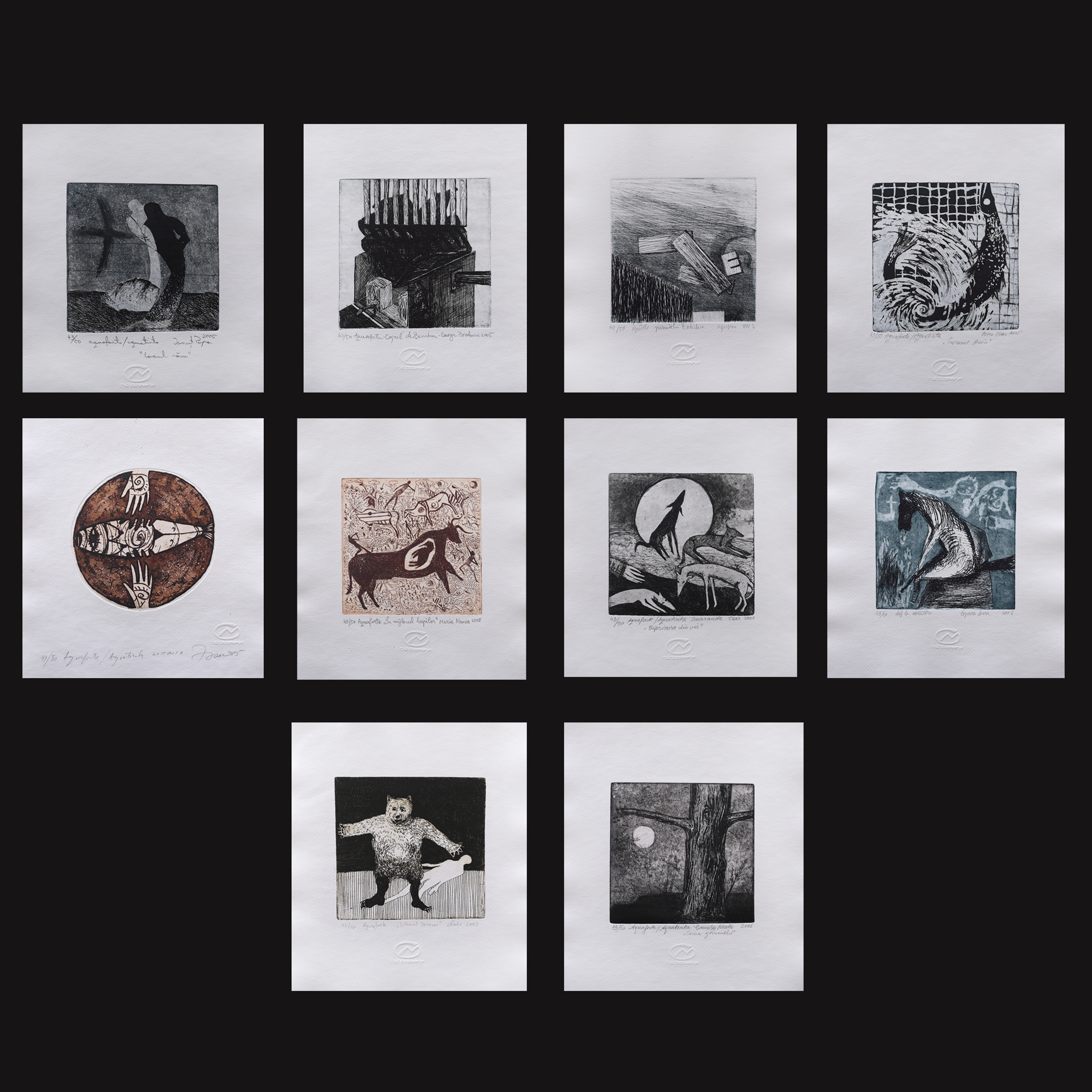 129. Lot format din 10 gravuri realizate în cadrul proiectului "Proza fantastica, V. Voiculescu", realizat de tabăra de creație de la Sinaia, coordonator Iuri Isar, 2005 [2005]