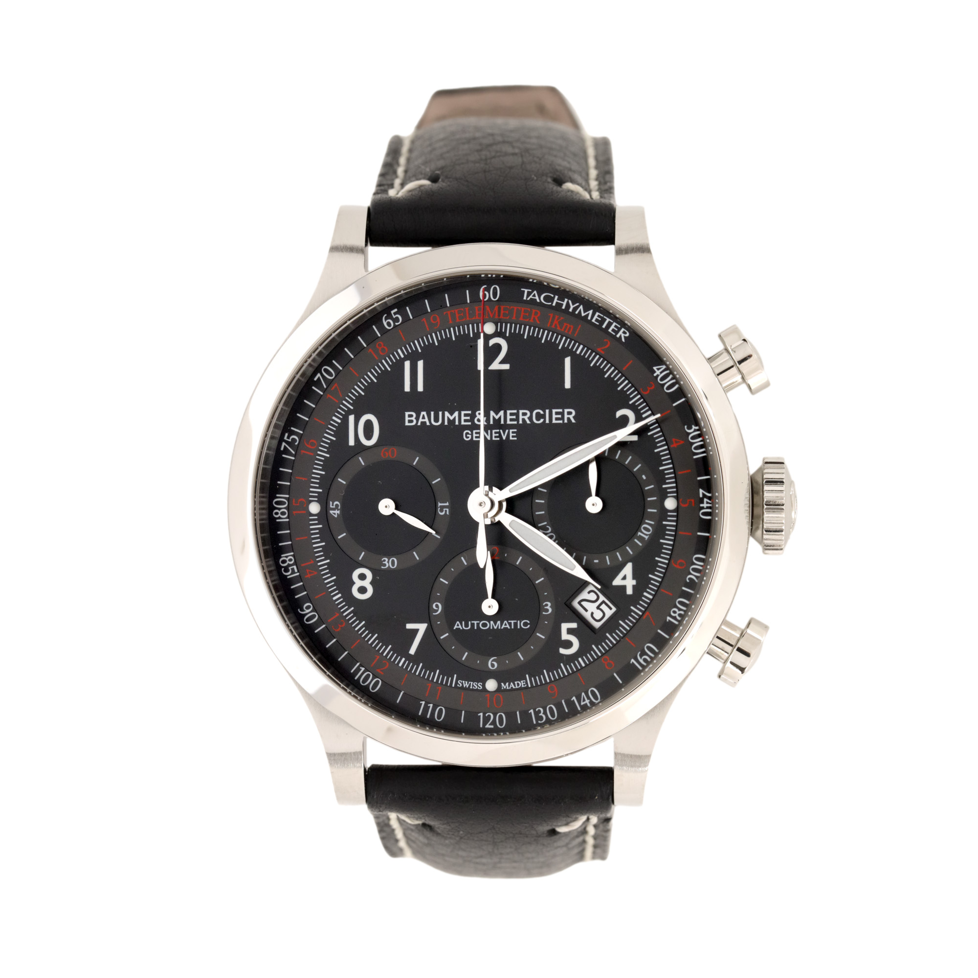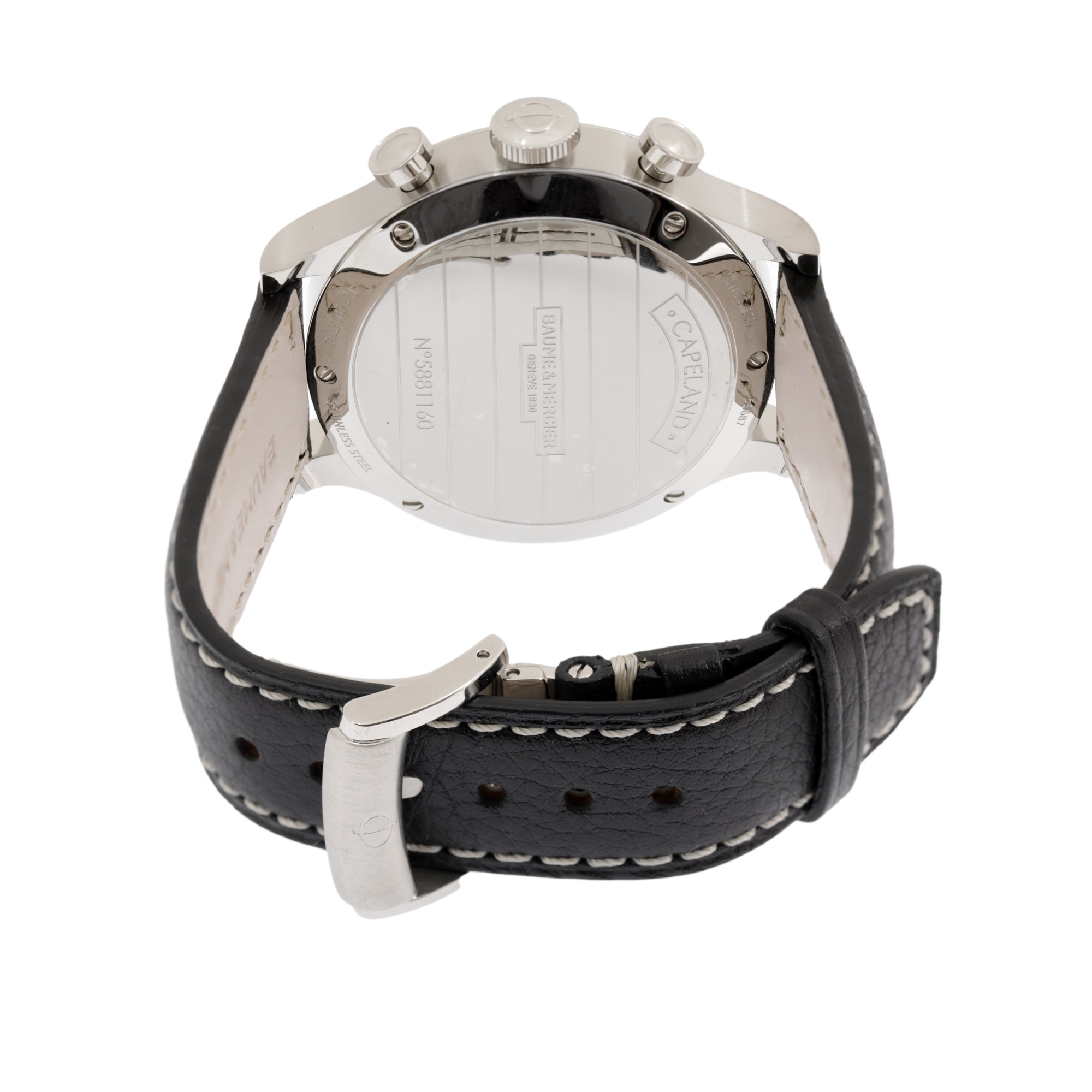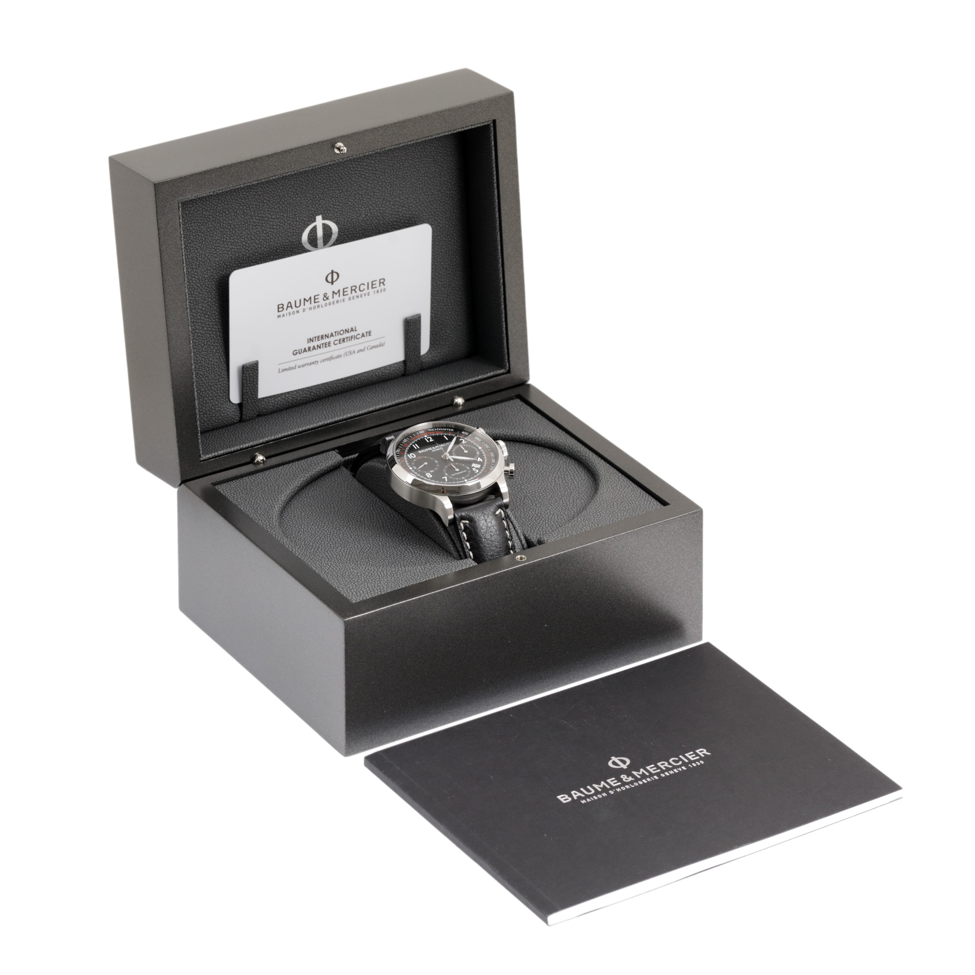 Ceas Baume & Mercier Capeland XL, nou, de mână, bărbătesc, referință M0A10001. Mecanism automatic, calibrul Valjoux 7753, cu funcție de chronograph. Cadran de culoare negru, indici cu numerale arabe, cu un registru pentru secundar în dreptul orei 9, un registru pentru dată între orele 4 și 5 și două registre pentru funcția de chronograph în dreptul orelor 3 și 6. Curea originală, din piele, de culoare fumurie, cu sistem de închidere de tip deployant. Accesorii: cutia originală, card de garanție și manual de utilizare.