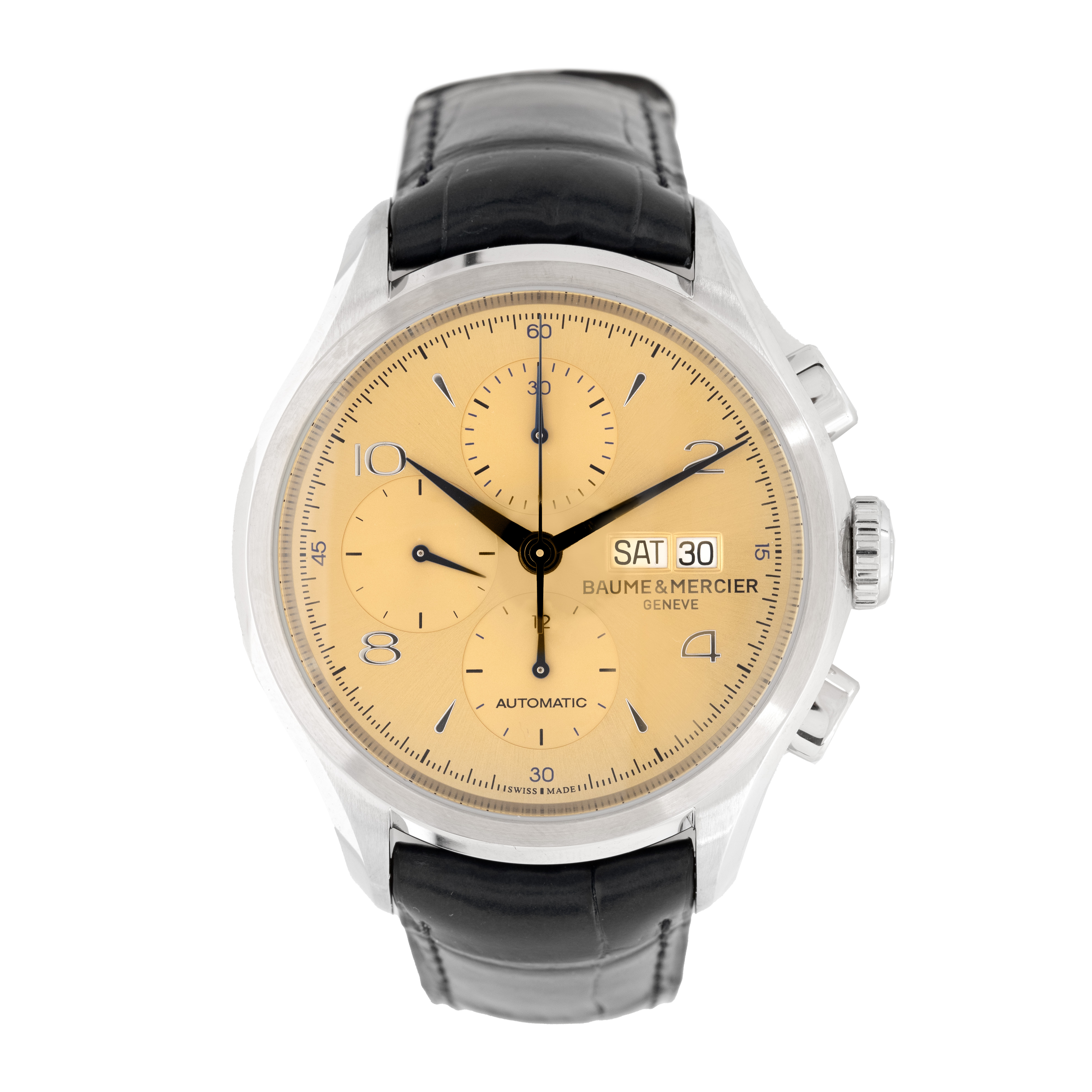 Ceas Baume & Mercier Clifton Chronograph, nou, de mână, bărbătesc, referință MOA 10240. Mecanism automatic, calibrul BM137750, mecanism de bază Valjoux 7750 cu funcție de chronograph, anterior vitrat. Cadran de culoare auriu, indici numerale arabe pentru orele 2, 4, 8, 10 și baghete pentru restulorelor, Registru dublu pentru dată și ziua săptămânii în dreptul orei 3, registru pentru secundar în dreptul orei 9, două registre pentru funcția de chronograph. Curea originală, din piele, de culoare albastră, cu sistem de închidere de tip deployant. Accesorii: cutia originală și broșură.