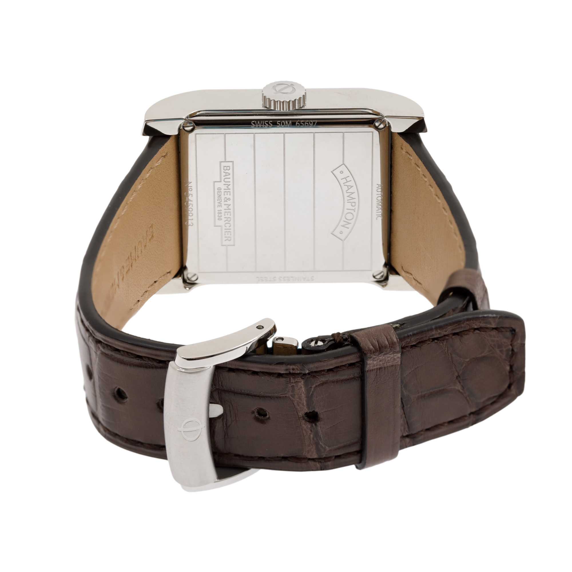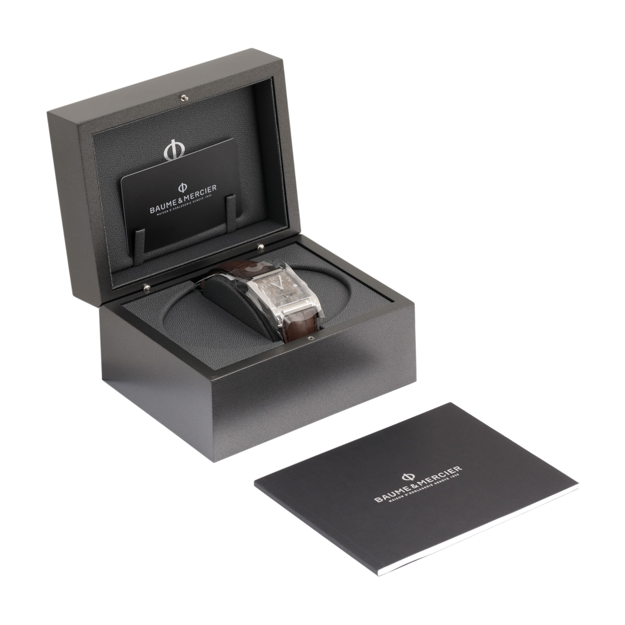 Ceas Baume & Mercier Hampton Rectangular, nou, de mână, bărbătesc, referință M0A10028. Mecanism automatic, calibrul 2824. Cadran de culoare maro, indici cu numerale arabe, cu un registru pentru dată în dreptul orei 3 și un registru pentru secundar în dreptul orei 6. Curea originală, din piele, de culoare maro, cu sistem de închidere de tip clasic. Accesorii: cutia originală, card de garanție.