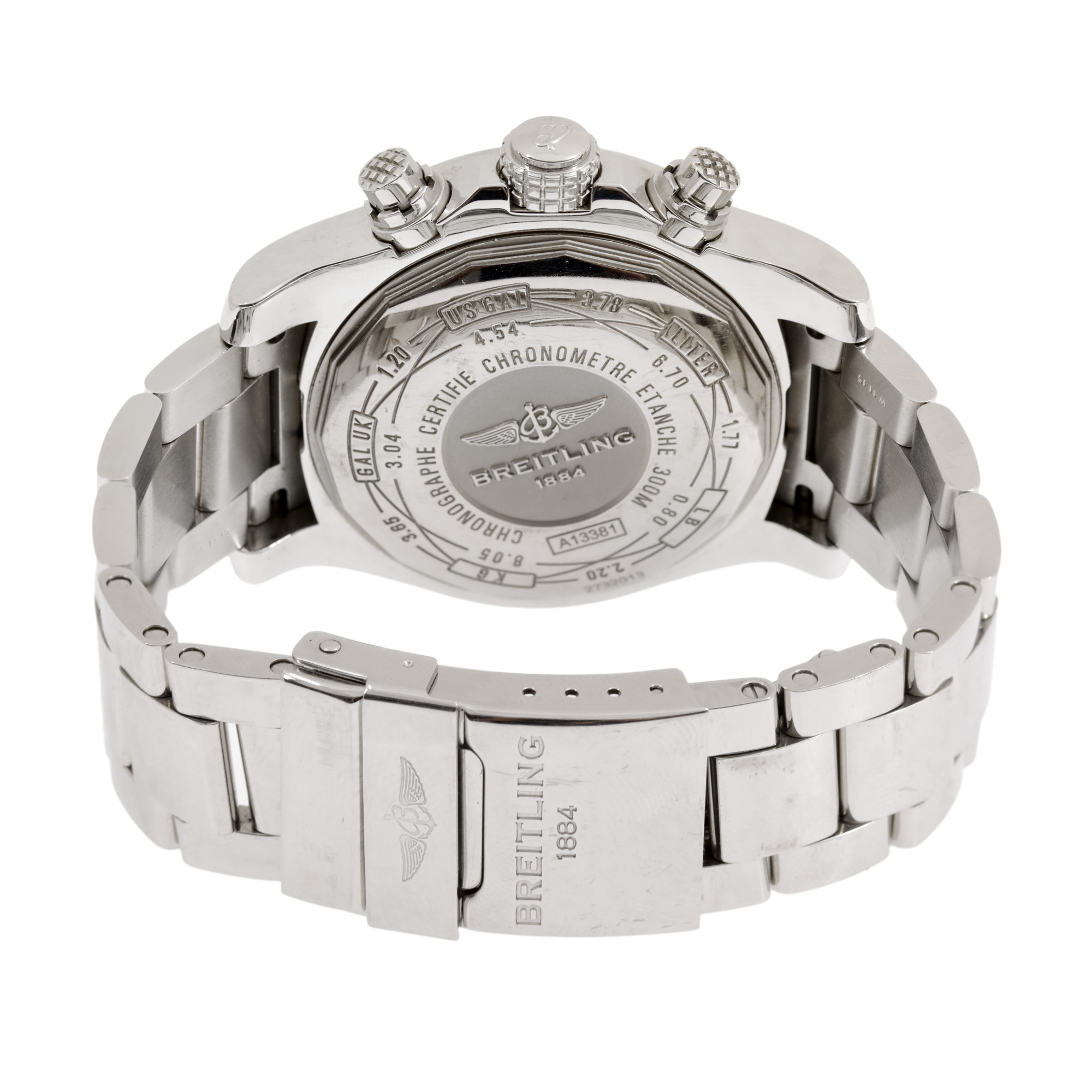 Ceas Breitling Avenger II, de mână, bărbătesc, referință A1338111/BC. Mecanism automatic calibrul BC13 cu funcție de chronograph, bezel mobil unidirecțional. Cadran de culoare negru, indici numerale arabe, registru pentru secundar în dreptul orei 9, două registre pentru chronograph în dreptul orelor 6 și 12, registru pentru dată în dreptul orei 3. Brățară originală din oțel, cu sistem de închidere de tip deployant. Accesorii: cutia originală și card electronic de garanție.
