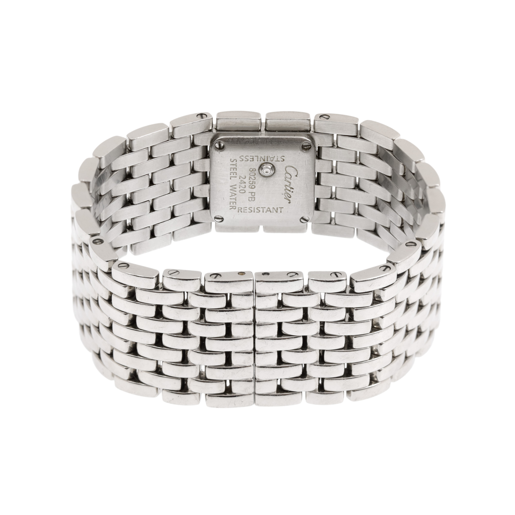 Ceas Cartier Panthere, de mână, de damă, referință 2420. Mecanism quartz. Cadran din sidef cu indici numerale romane. Brățară originală, din oțel, cu sistem de închidere tip deployant.