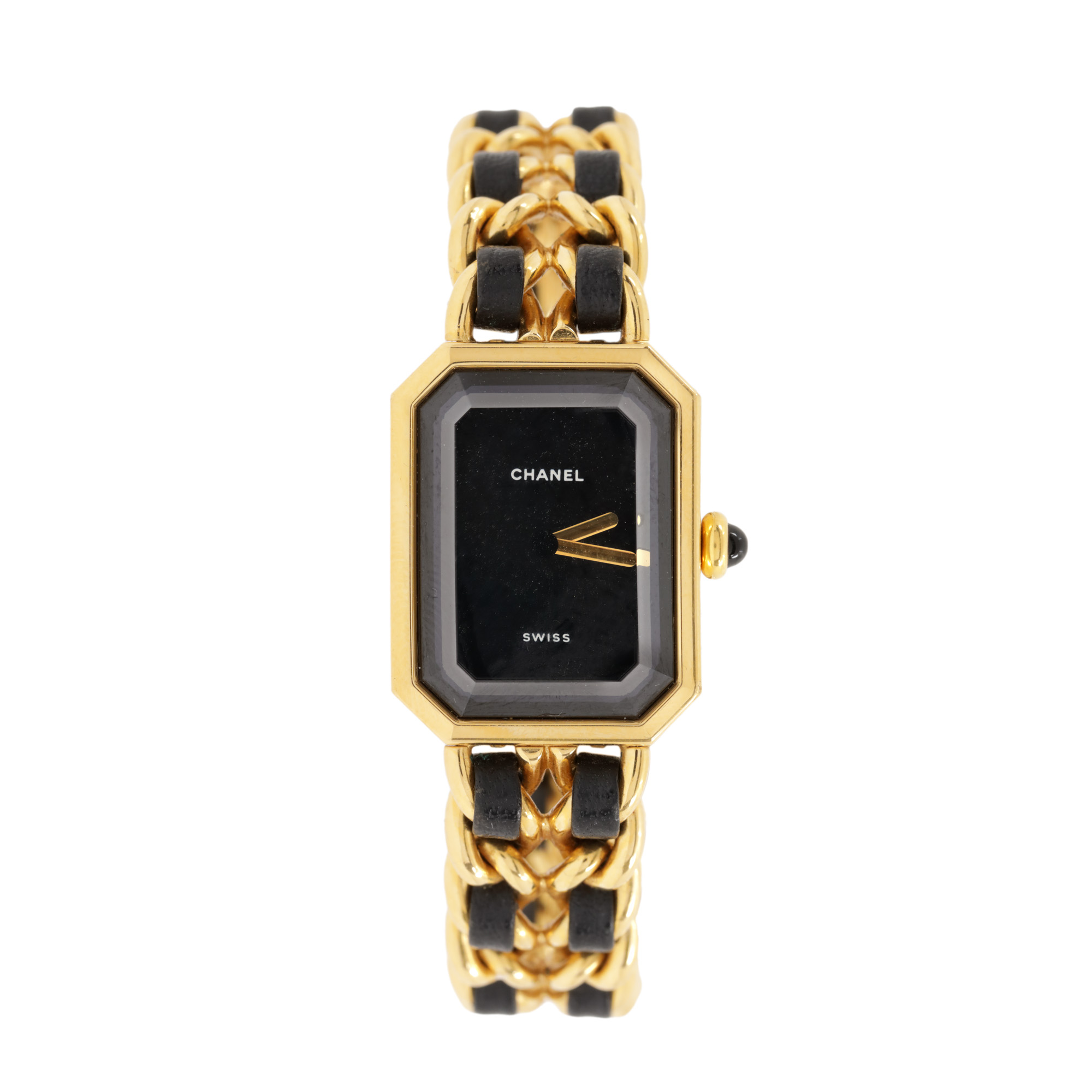 Ceas Chanel Premiere, din oțel placat cu aur, de mână, de damă. Mecanism quartz. Cadran de culoare negru, fără indici. Brățară originală, din oțel placat cu aur și inserții din piele neagră, cu sistem de închidere de tip clemă.