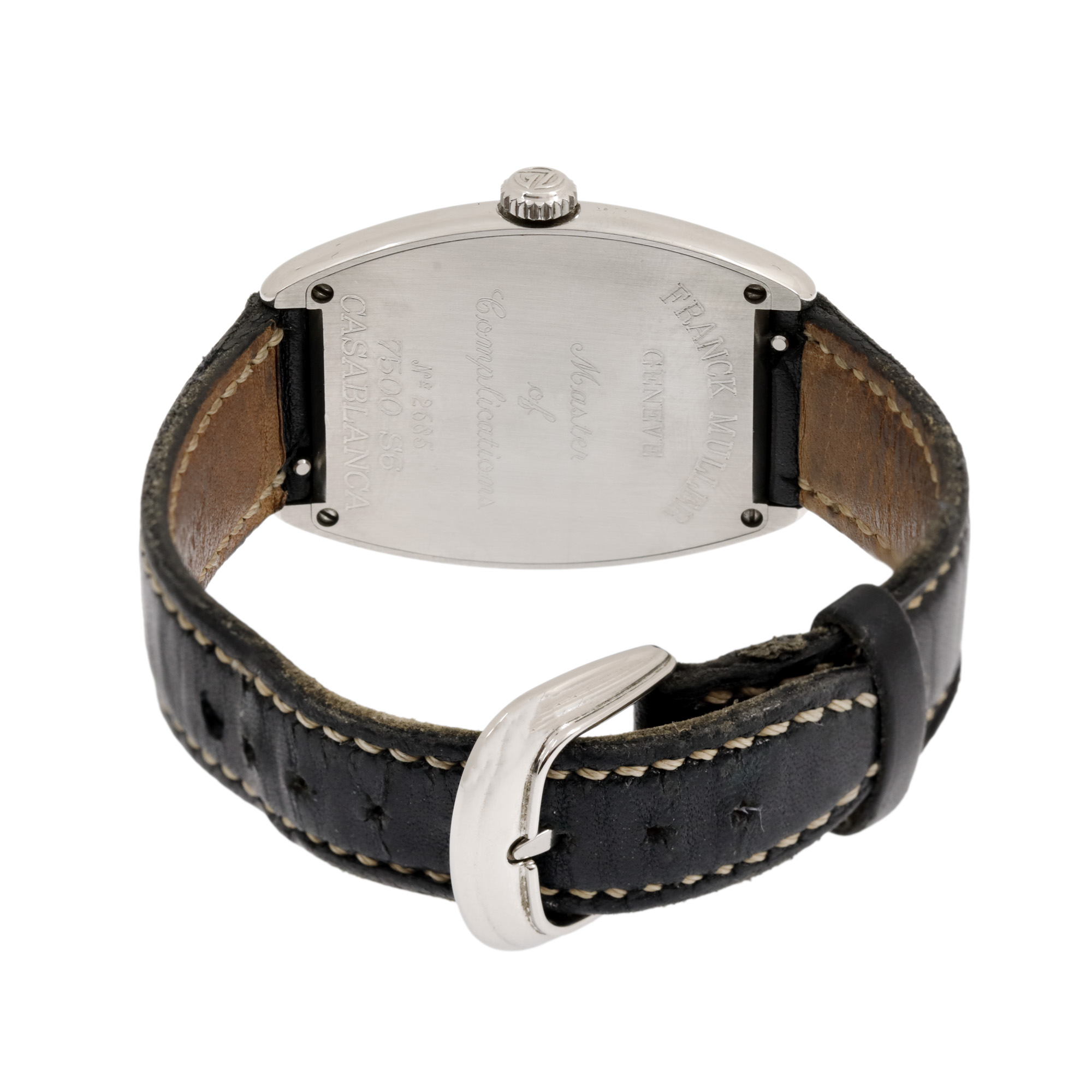 Ceas Franck Muller Casablanca, de mână, unisex, referință 7500 S6C. Mecanism cu armare manuală, calibrul MVTFM 7500. Cadran de culoare negru, indici cu numerale arabe, cu un registru pentru dată în dreptul orei 6. Curea originală, din piele, de culoare bleumarin, cu sistem de închidere de tip clasic. Accesorii: cutia originală.