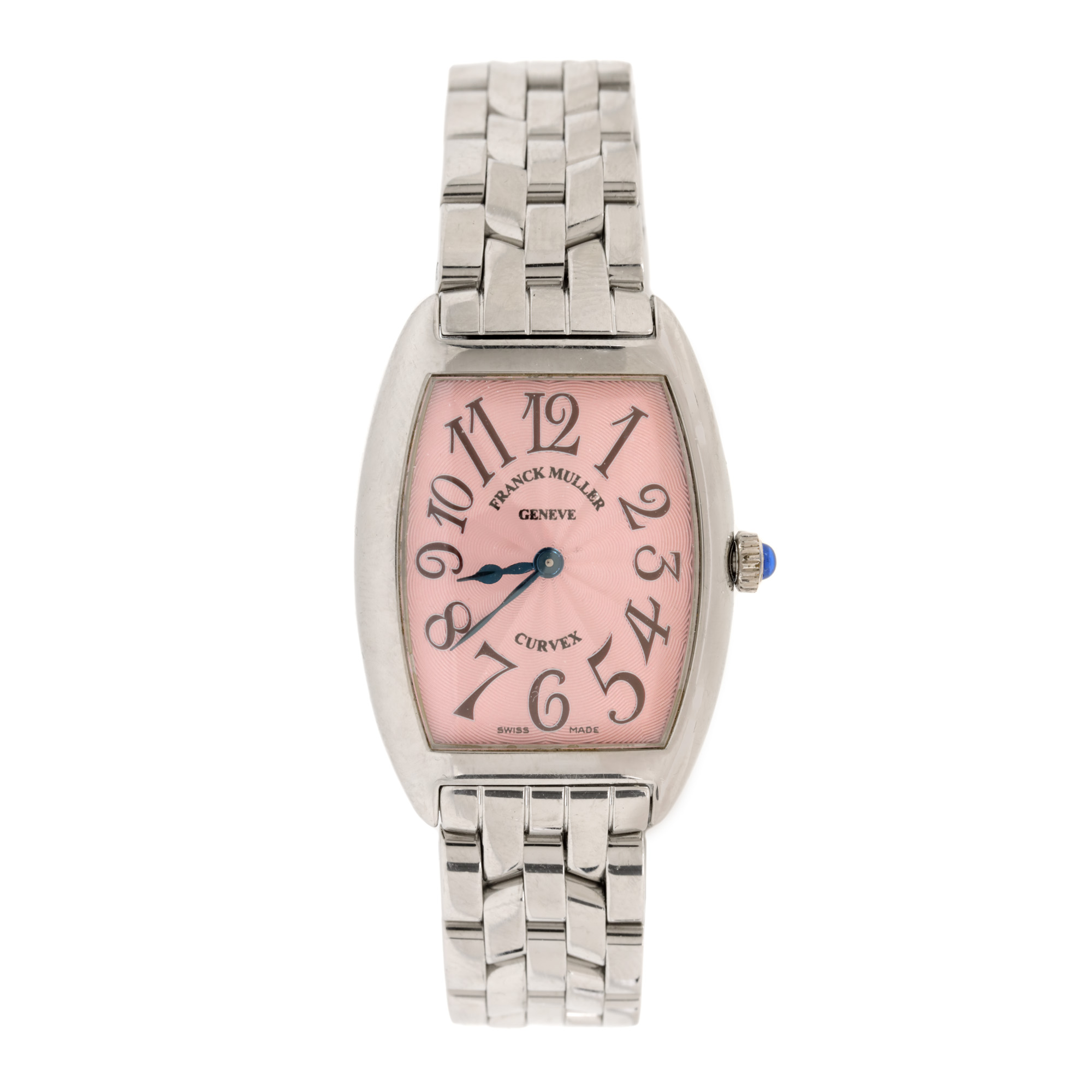 Ceas Franck Muller Curvex, de mână, de damă, referință 1752QZ. Mecanism quartz. Cadran de culoare roz, indici numerale arabe. Brățară originală, din oțel, cu sistem de închidere de tip deployant.