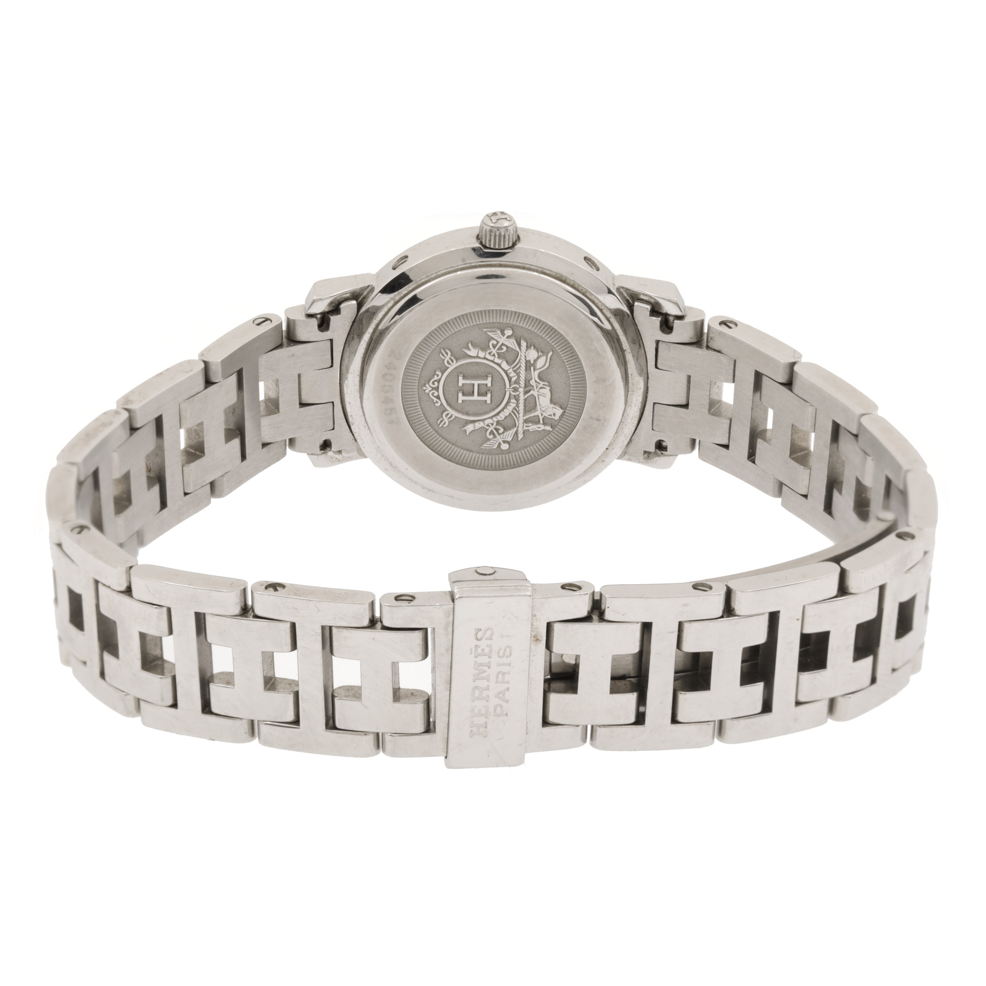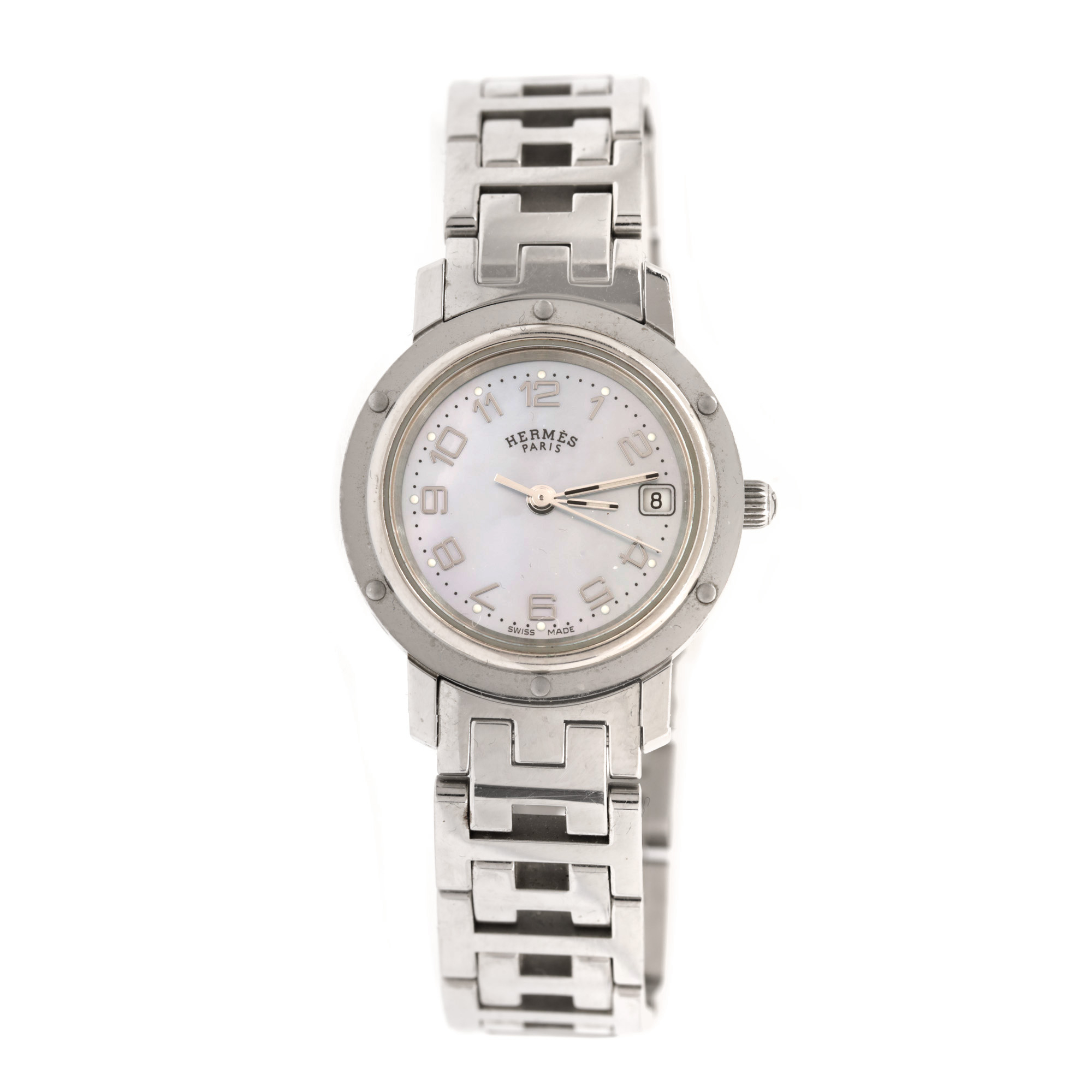 Ceas Hermes Clipper, de mână, de damă, referință CL4.210. Mecanism quartz, calibrul 251.262. Cadran mother of perarls, indici cu numerale arabe, cu un registru pentru dată în dreptul orei 3. Brățară originală, din oțel inoxidabil, cu sistem de închidere de tip deployant.